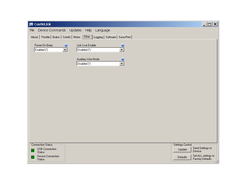 Základní parametry regulátoru lze naprogramovat pomocí plynové páky vysílače nebo programovací kartou. Veškeré parametry regulátoru se pak programují volně dostupnou aplikací Castle Link určené na počítače s operačním systémem Windows. Regulátor se připojuje k počítači přes speciální převodník do USB portu. Pro snazší připojení USB převodníku doporučujeme zakoupit programovací propojku Quick Connect.