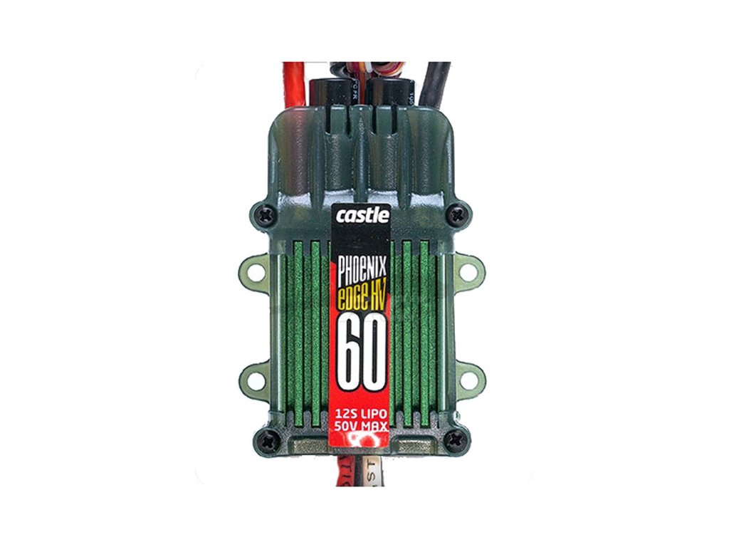Špičkový regulátor Phoenix Edge 60 HV od Castle Creations je určen pro vrtulníky a letadla. Napájení 3 až 12 čl. LiPol akumulátorů, max. trvalý proud 60 A. Pro dobrý obvod tepla vznikajícího v tranzistorech je regulátor po svém obvodu vybaven velkým chladičem. Regulátor neobsahuje zdroj BEC.