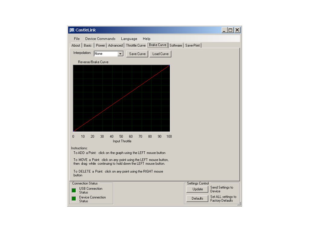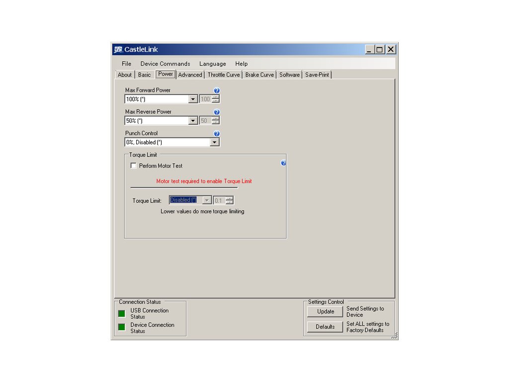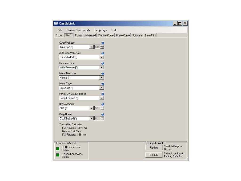 V regulátoru lze nastavit typ vypínacího napětí, hodnotu vypínacího napětí, smysl otáčení motoru, typ motoru, časování, maximální výkon vřed, max. výkon zpátečky, výkon brzdy, sílu brzdy v neutrálu, křivku plynu a křivku brzdy, Samozřejmostí je možnost přehrát firmware regulátoru a v budoucnu tak získat nové funkce.