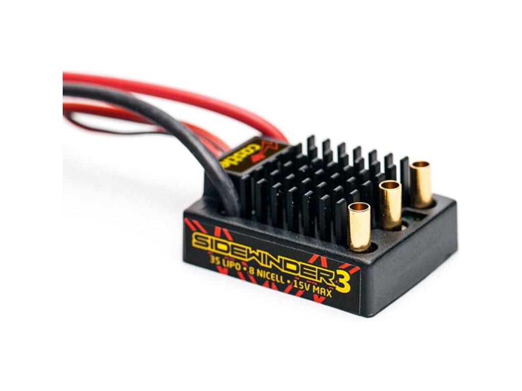 Regulátor Castle Sidewinder V3 má voděodolné provedení a je určen pro lehké až středně těžké RC modely aut v měřítku 1:10. Napájecí napětí regulátoru je 2 až 3 čl. LiPo nebo 6 až 8 čl. NiMH. Sidewinder 3 nabízí špičkové softwarové funkce a USB programování pomocí Castle USB adaptéru nebo programovací karty (prodávají se samostatně).