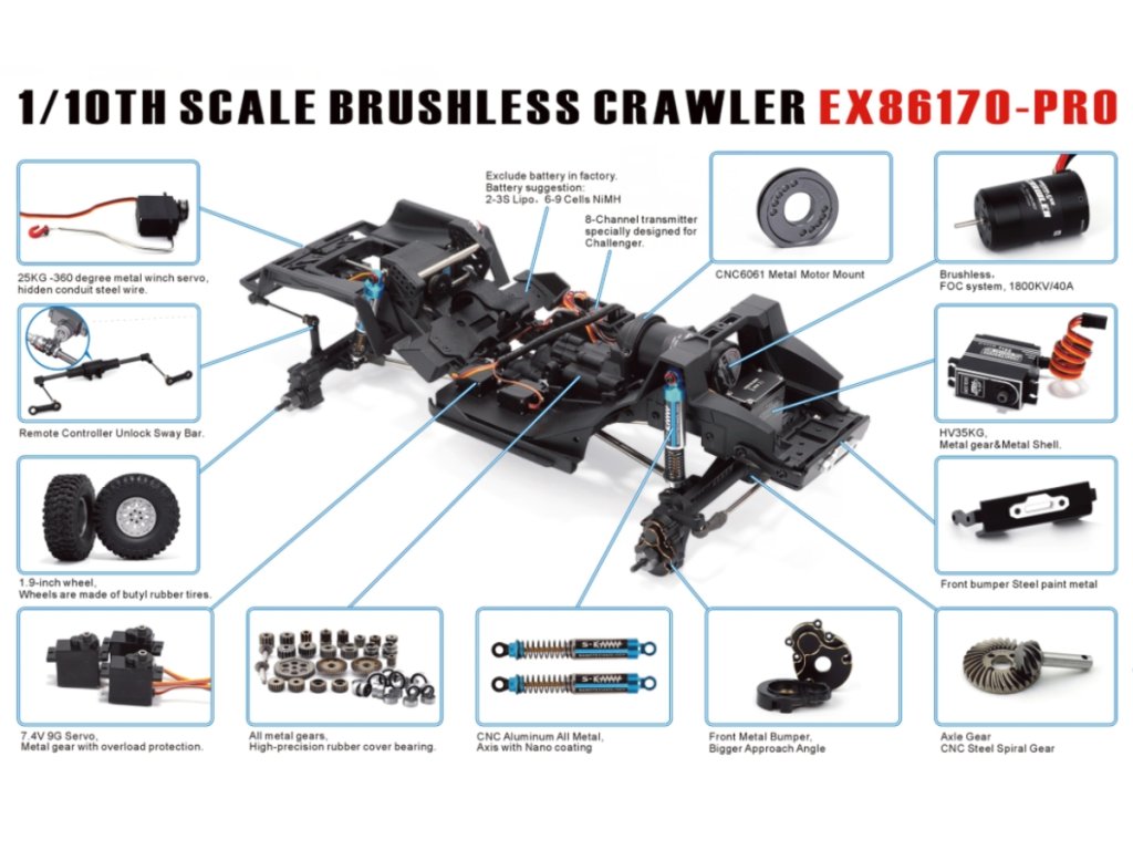Challenger PRO je poháněn střídavým systémem FOC od společnosti Hobbywing (WP Fusion BLSYS pro Crawler-540 SPEC-RTR), který se vyznačuje silným točivým momentem při nízkých otáčkách a vynikající linearitou. Motor běží hladce a tiše s vynikající vodotěsnou a prachotěsnou ochranou, a snadno se poradí se všemi klimatickými podmínkami a různými druhy terénu. Výstup BEC 7,4 V / 3 A přináší větší točivý moment pro vysokonapěťové servo.
