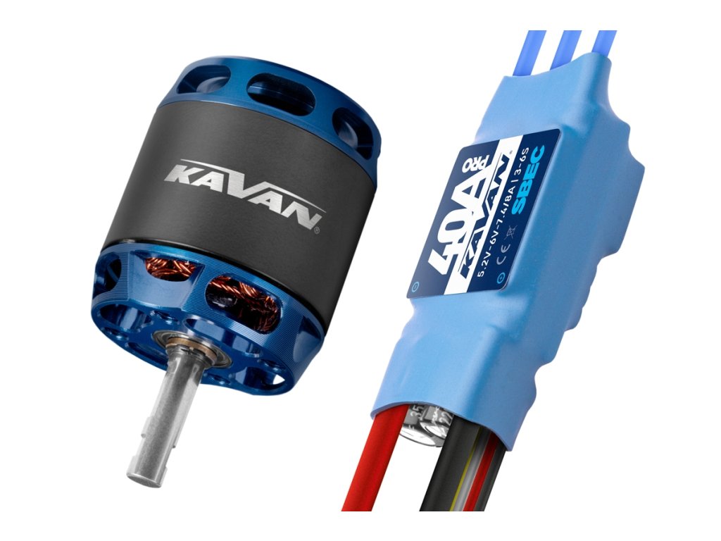 Combo set střídavého elektromotoru s rotačním pláštěm s regulátorem 40A pro modely letadel: větroň 800g, trenér 700g, akro 600g, KV2500 ot./min na V, napájení Lixx 2-4s, hřídel 4 mm.
