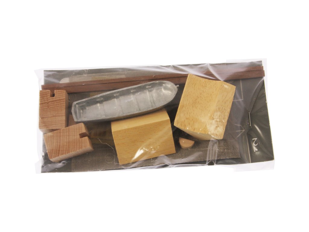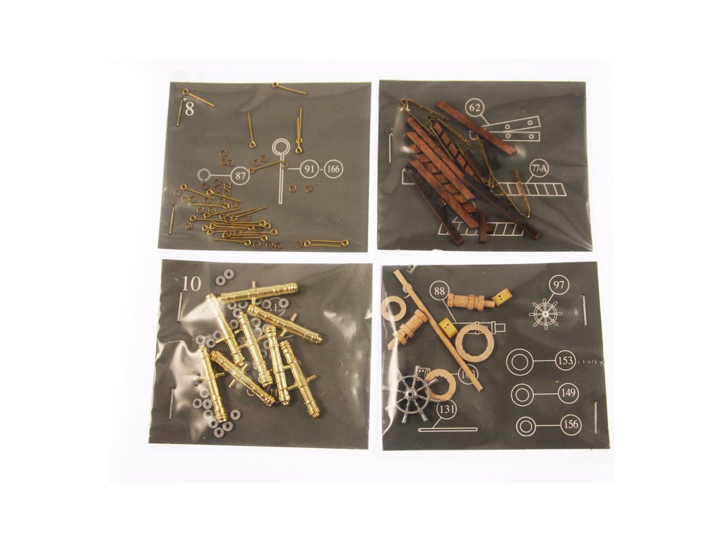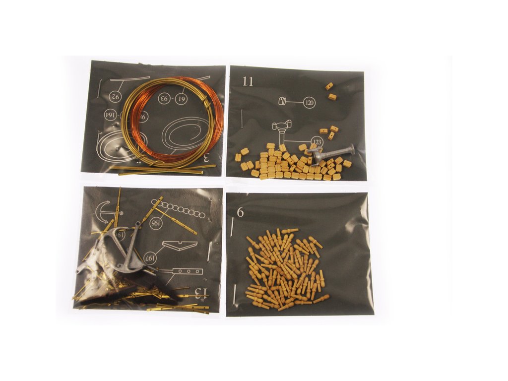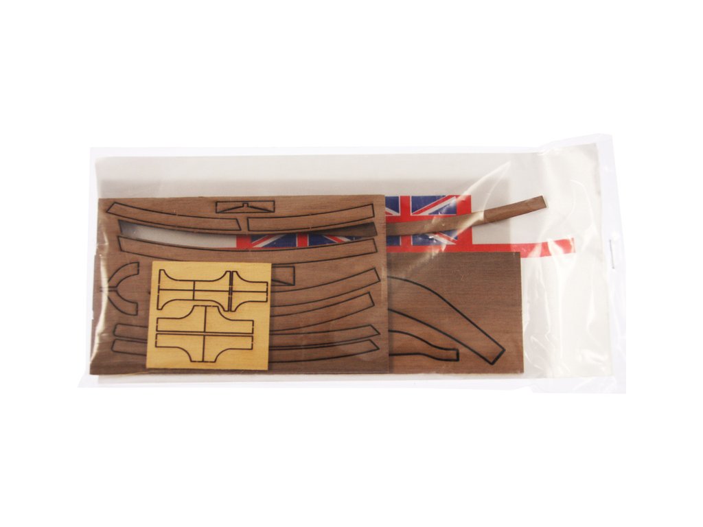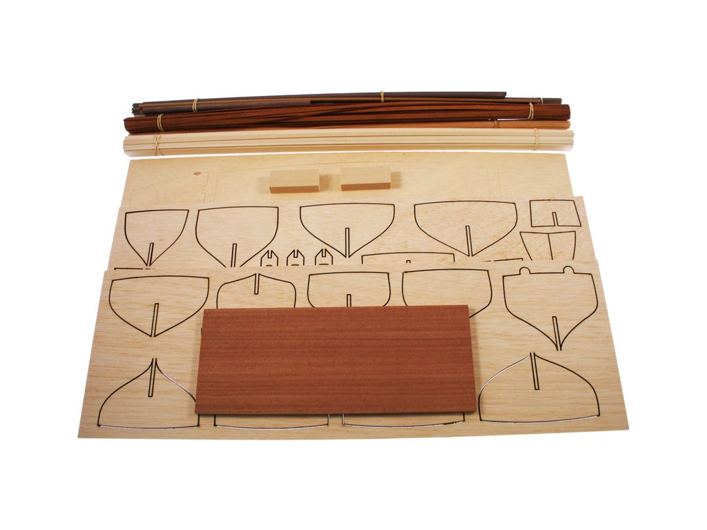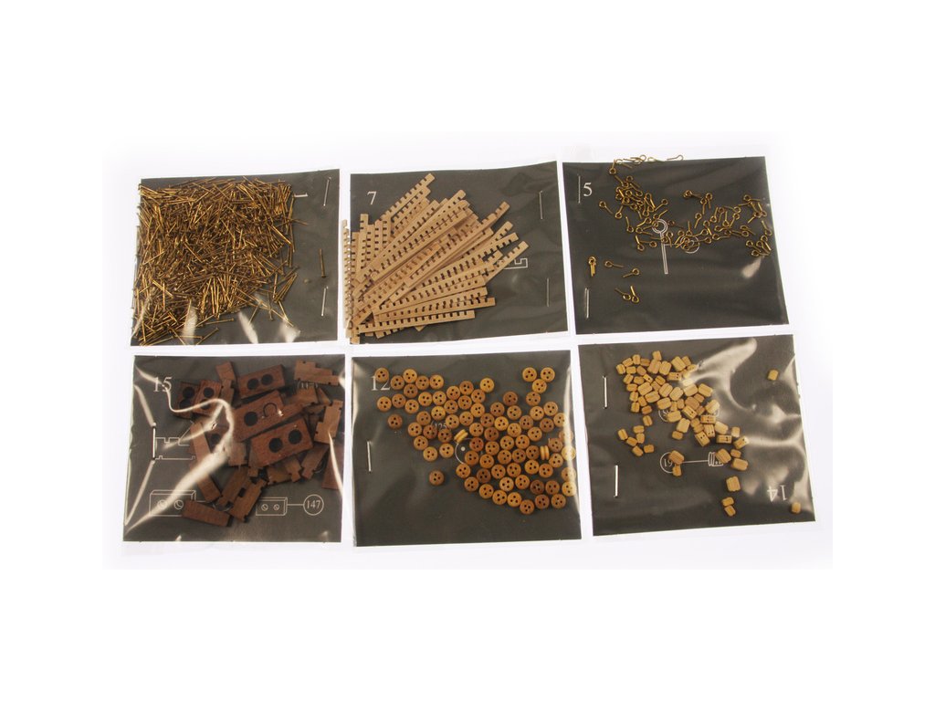 Balení obsahuje sadu překližkových dílů, sadu dřevěných lišt o různém průřezu, blistr s drobnými díly, díly z mosazi, sadu výkresů a vícejazyčný manuál.