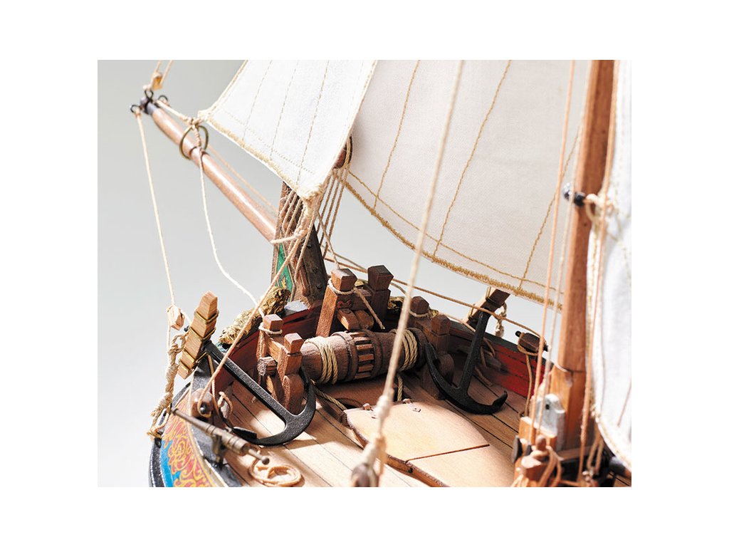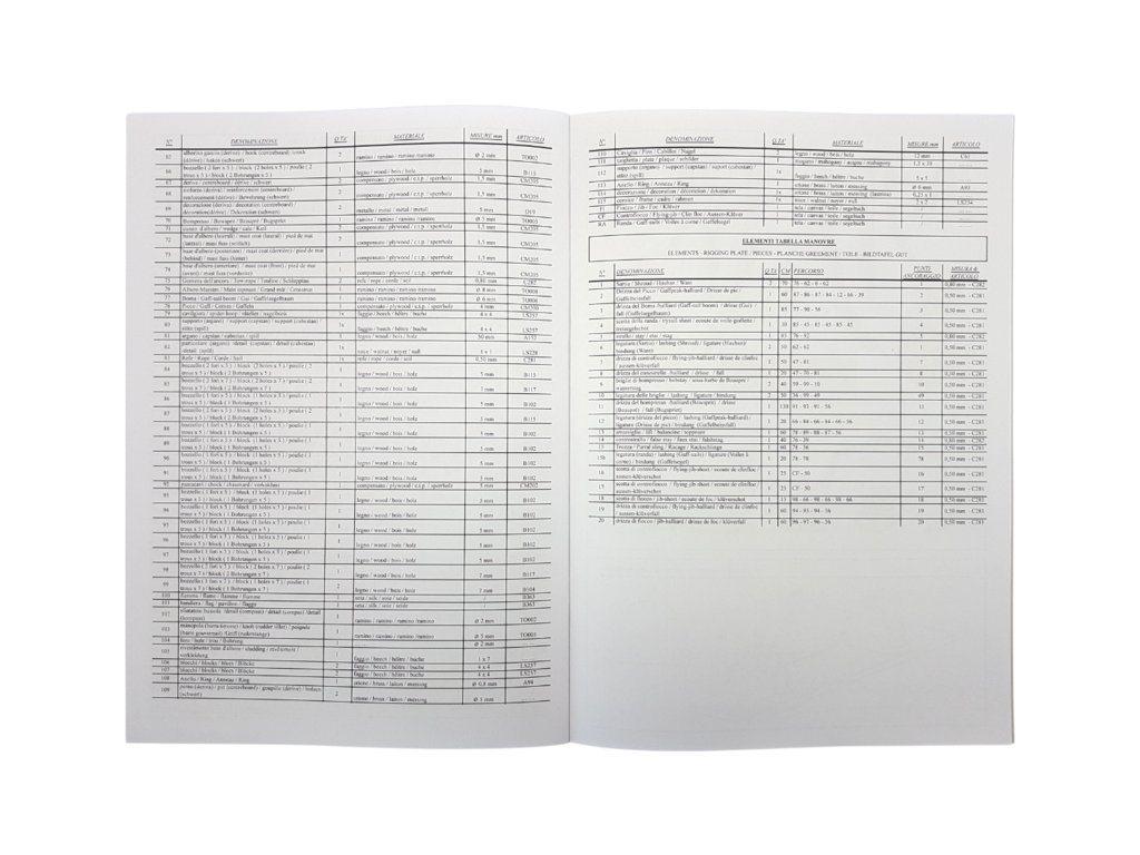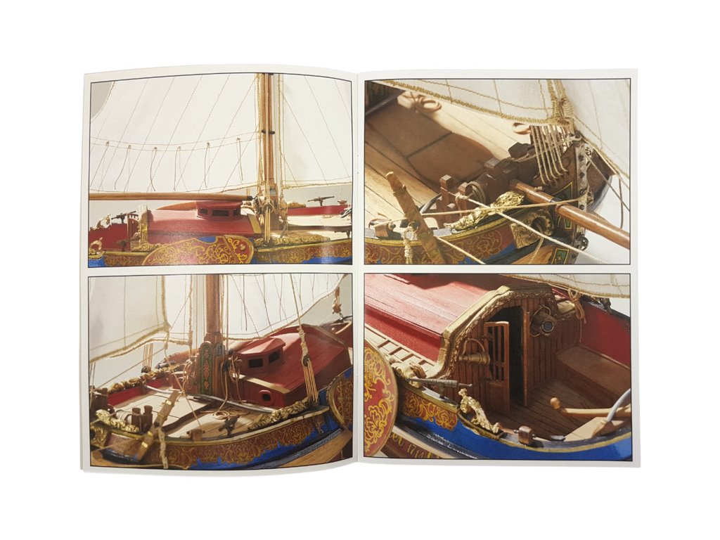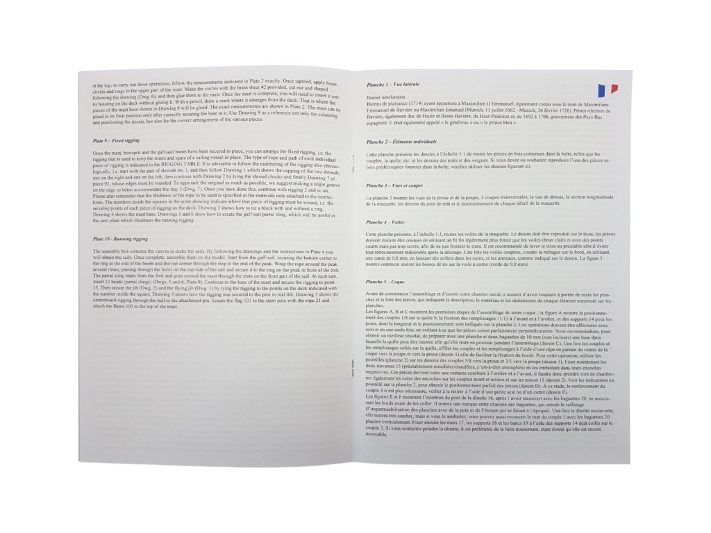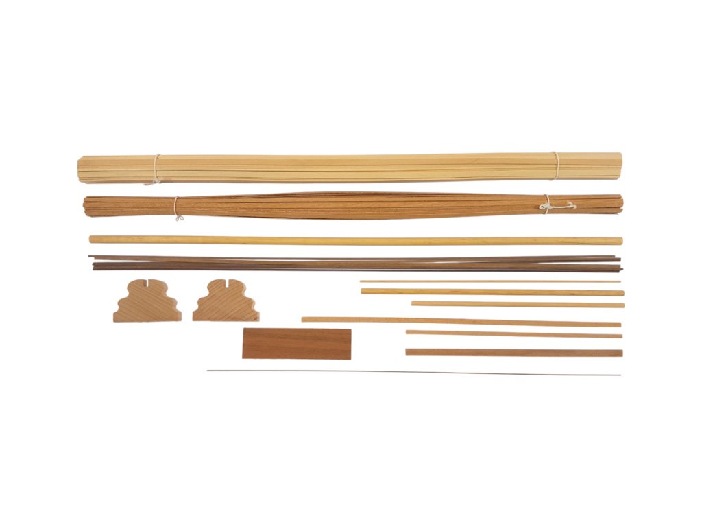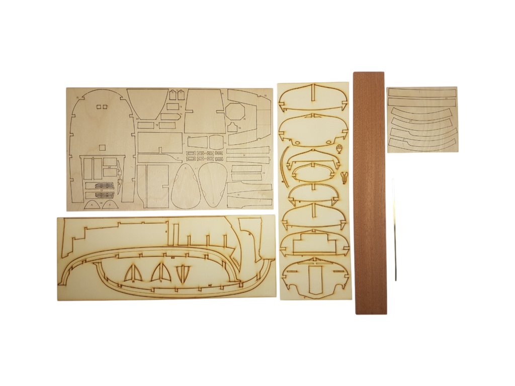 Po otevření víka krabice naleznete dřevěné díly modelu z překližky, lišty, drobné součásti v blistru, odlitky, kování, lanoví, plachtovinu, sadu výkresů a manuál.