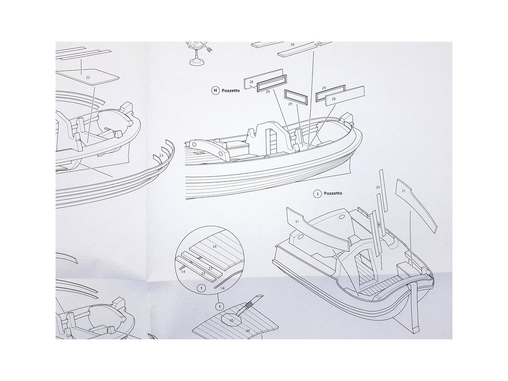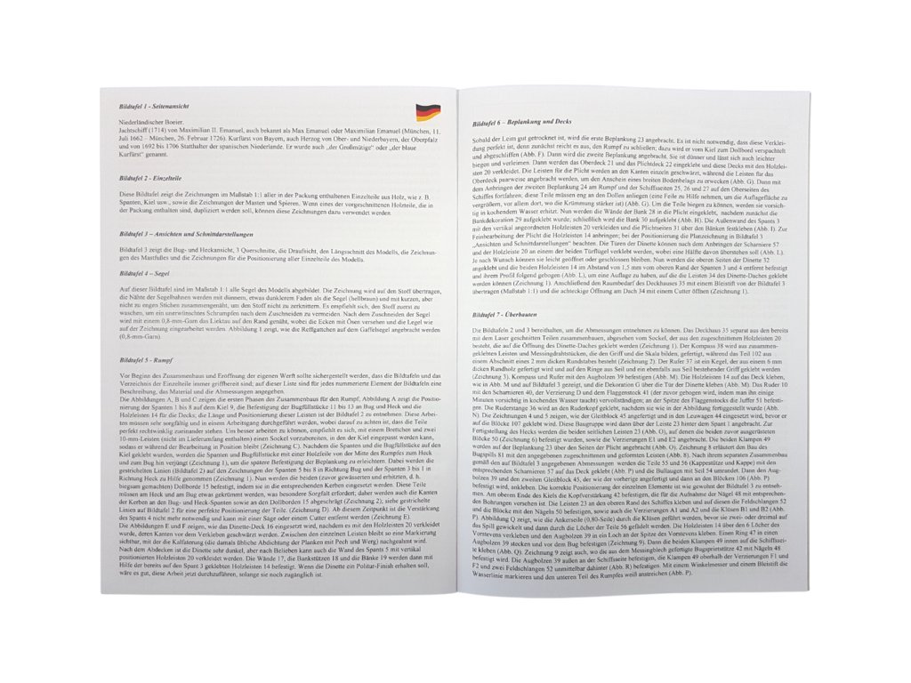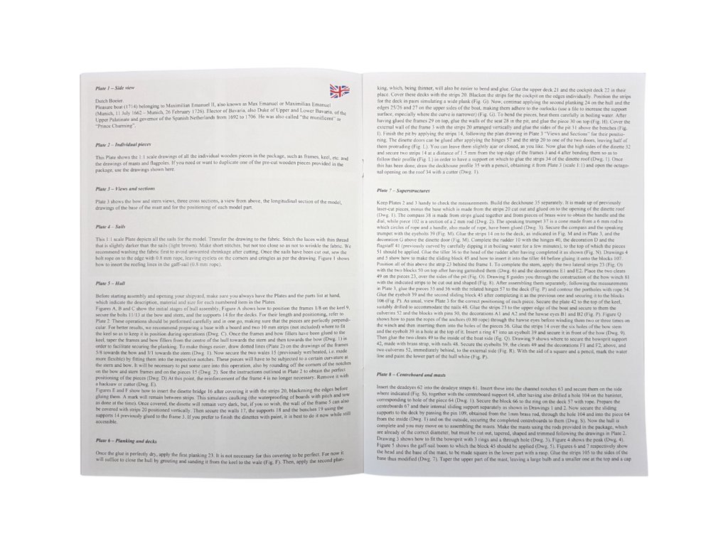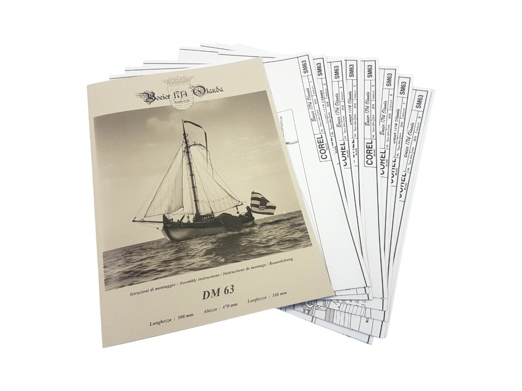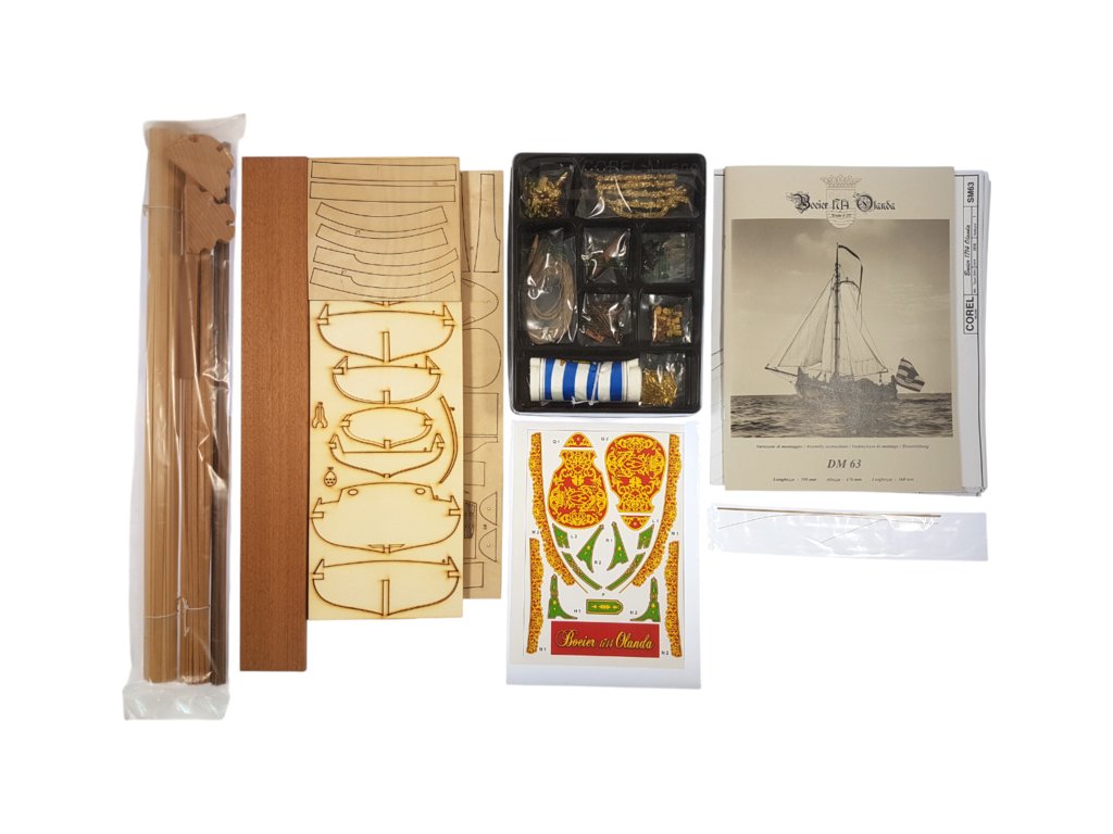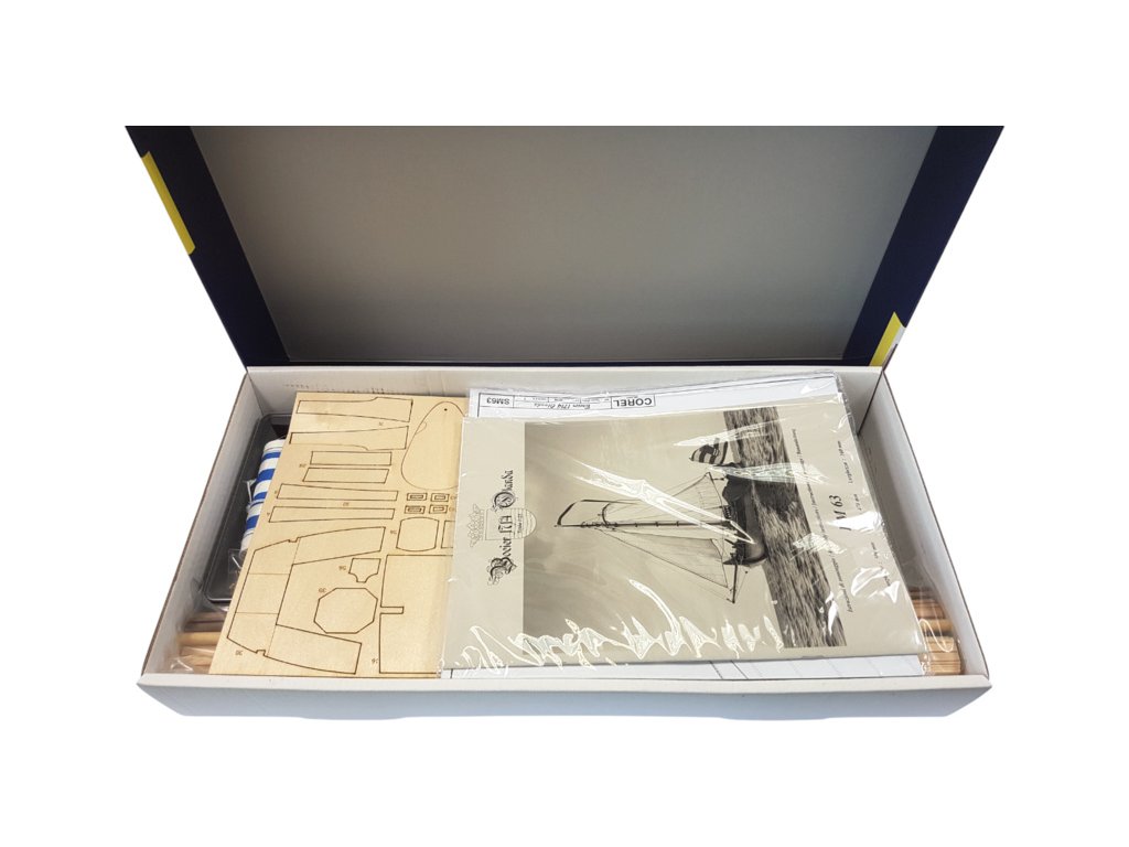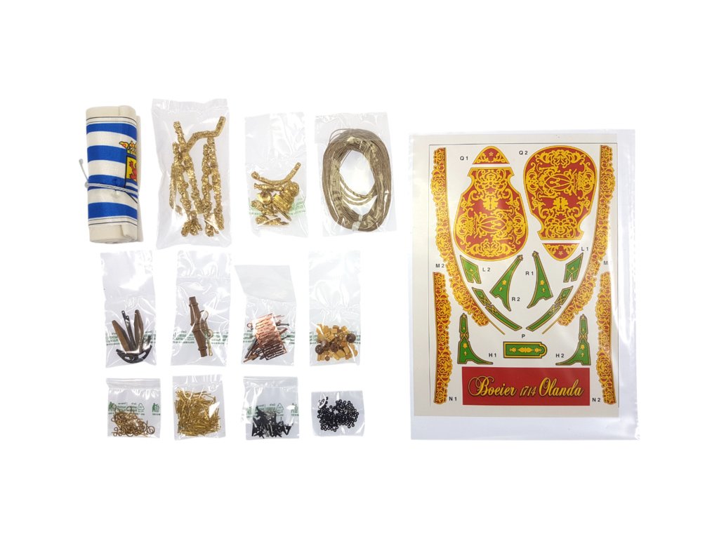 Součástí balení stavebnice statického modelu lodi COREL Boeier 1714 1:25, je sada výkresů modelu, manuál, sada překližkových laserem řezaných dílů, lišty, drobné díly v blistru - mosazné odlitky, kování, kladky, hřebíky, oka, lana na lanoví, vlajka, plachtovina na ušití plachet a arch samolepek.