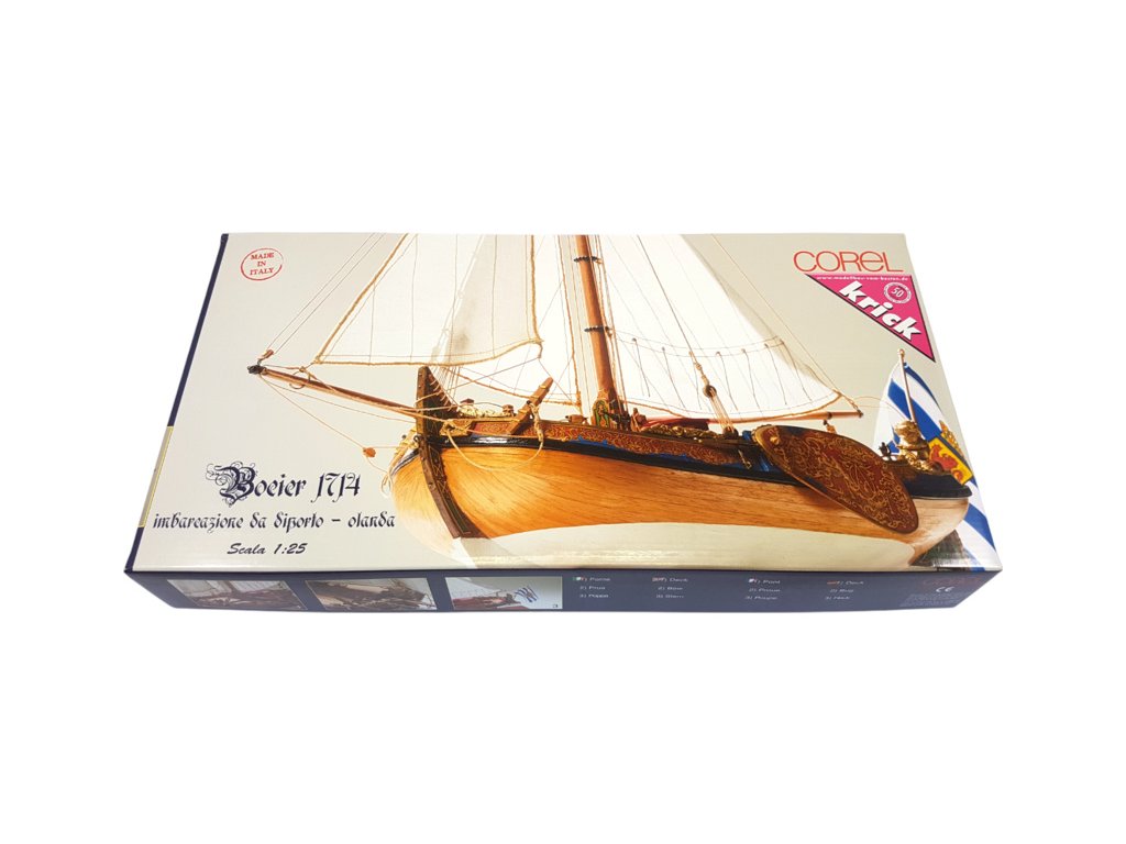 Stavebnice neplovoucího modelu lodi COREL Boeier z roku 1714 v měřítku 1:25. Délka je 500 mm. V balení je materiál ke stavbě. Dřevěné překližkové díly jsou přesně řezané laserem, trup se staví metodou dvojí plaňkování. Kromě dřevěný dílů lišt a doplňků jsou obsaženy dekorace v podobě kovový odlitků, potřebné kování, plachtovina, vlajka a díly na stavbu stojánku. Stavbou Vás provedou stavební plány a manuál.