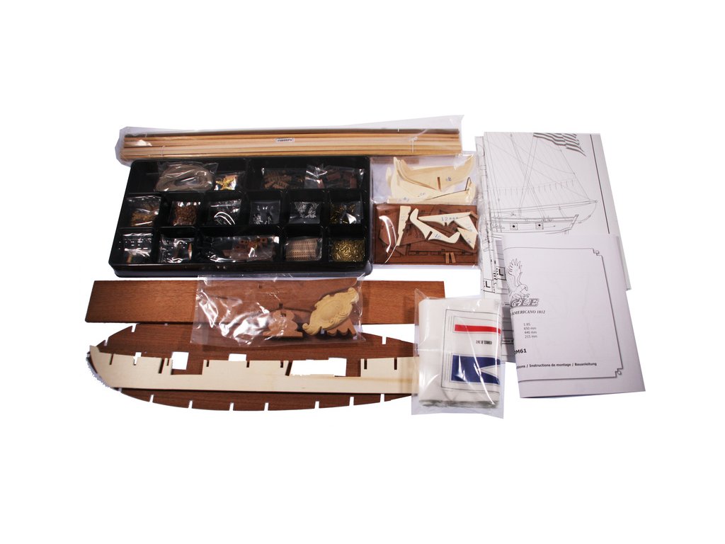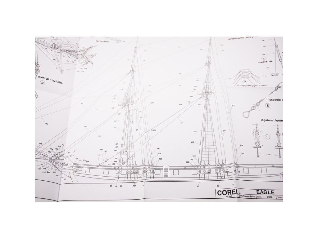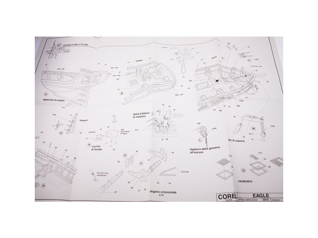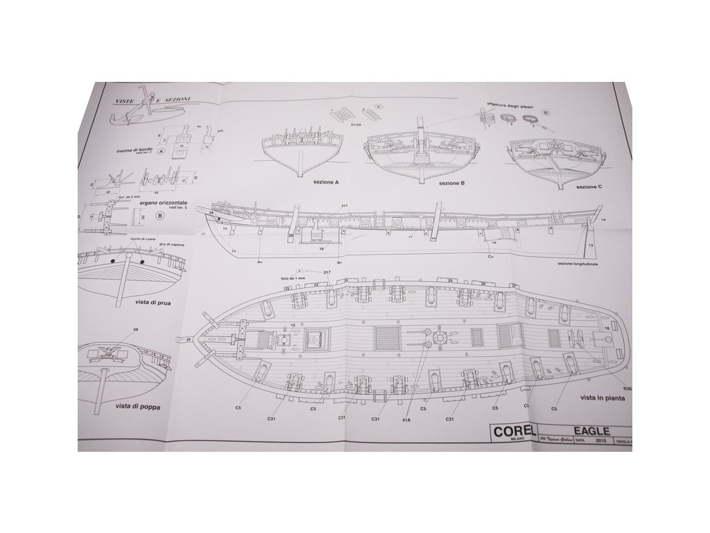 Stavebnice neplovoucího modelu COREL Eagle briga v měřítku 1:85 z roku 1812. USS Eagle, šalupa, byla obchodní lodˇ, zakoupená ve Vergennes, Vermont na jezeře Champlain v roce 1812 a vybavena pro námořní službu. Plán je velmi detailní, v balení jsou dřevěné díly, lišty a množství kování, lanoví, plátno na plachty a další.