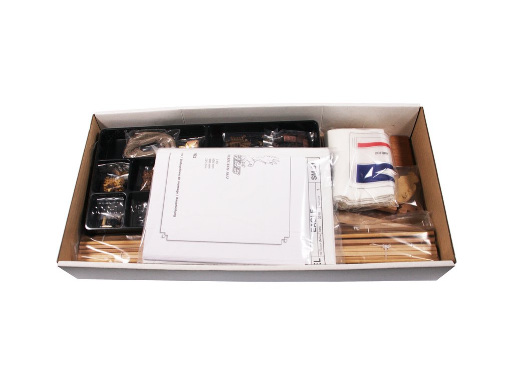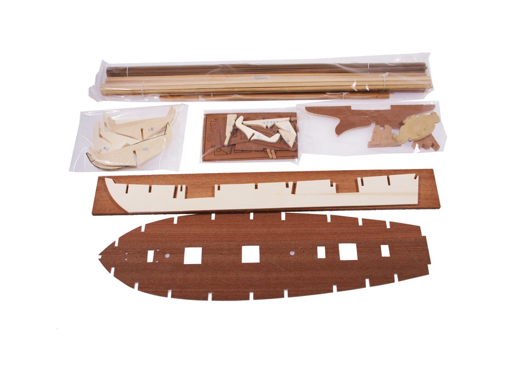 Balení obsahuje sadu překližkových dílů, sadu dřevěných lišt o různém průřezu, blistr s drobnými díly, díly z mosazi, sadu výkresů a vícejazyčný manuál.