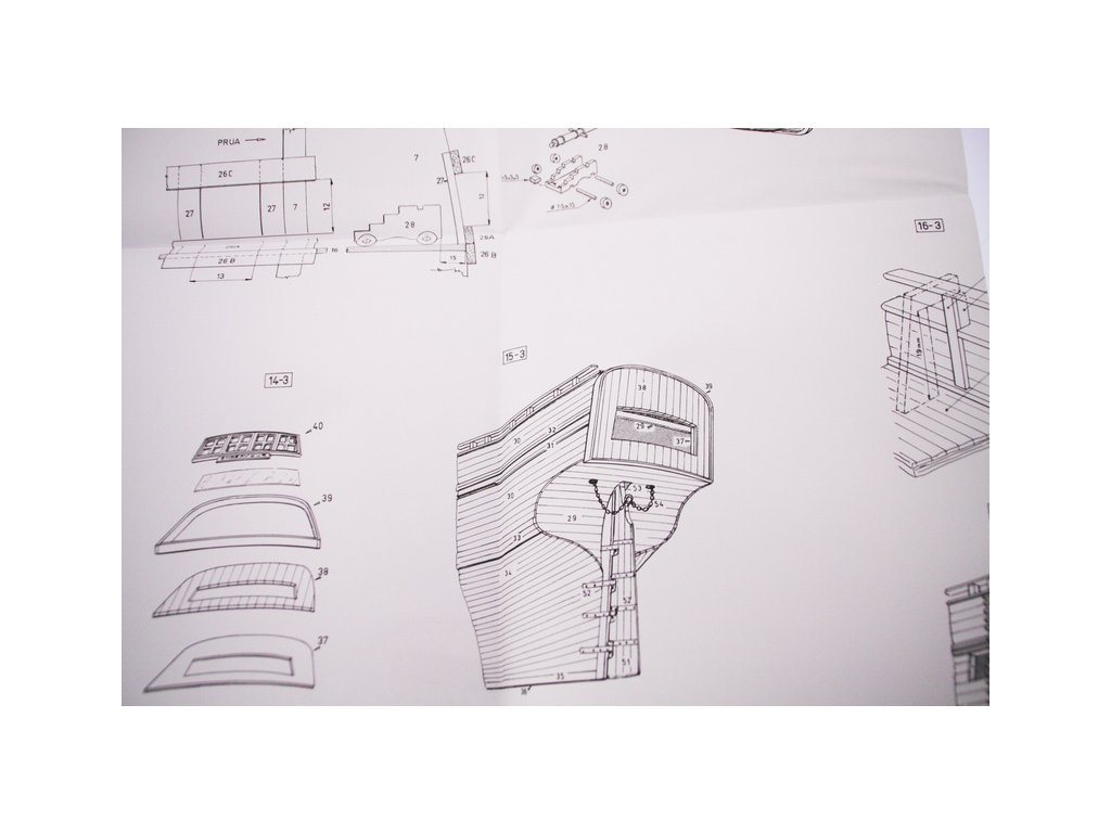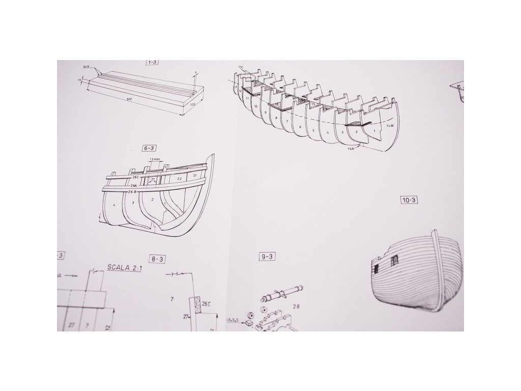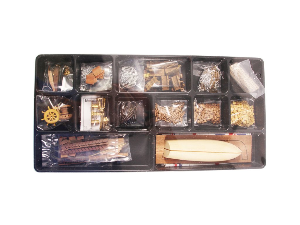 Balení obsahuje sadu překližkových dílů, sadu dřevěných lišt o různém průřezu, blistr s drobnými díly, díly z mosazi, sadu výkresů a vícejazyčný manuál.