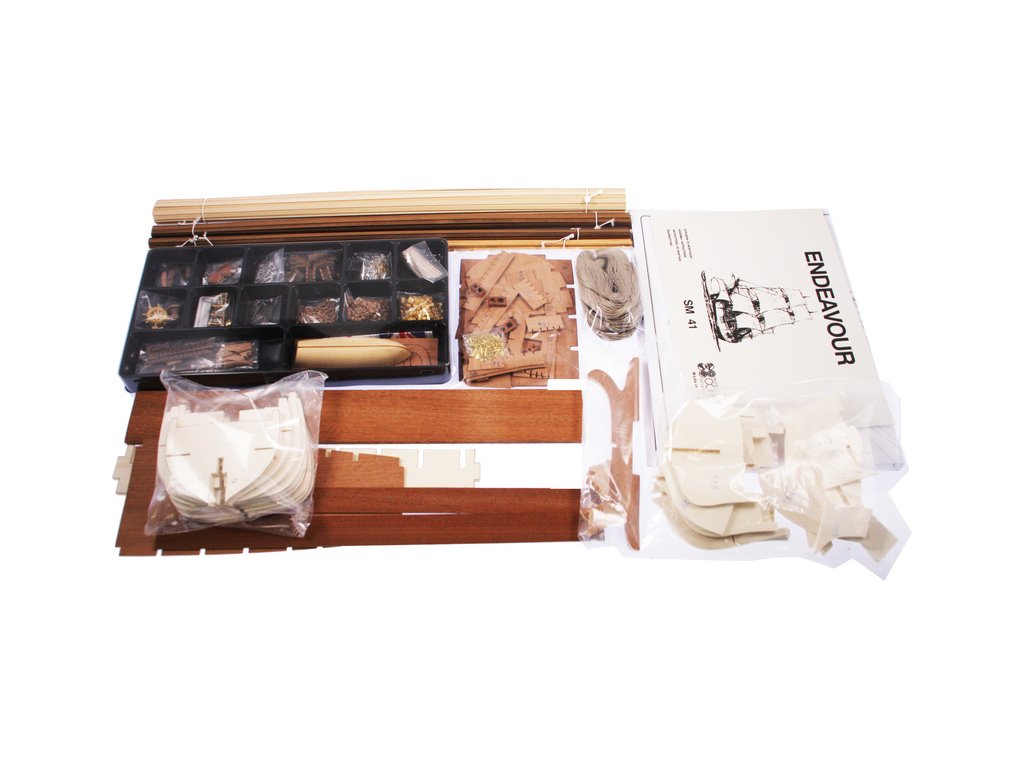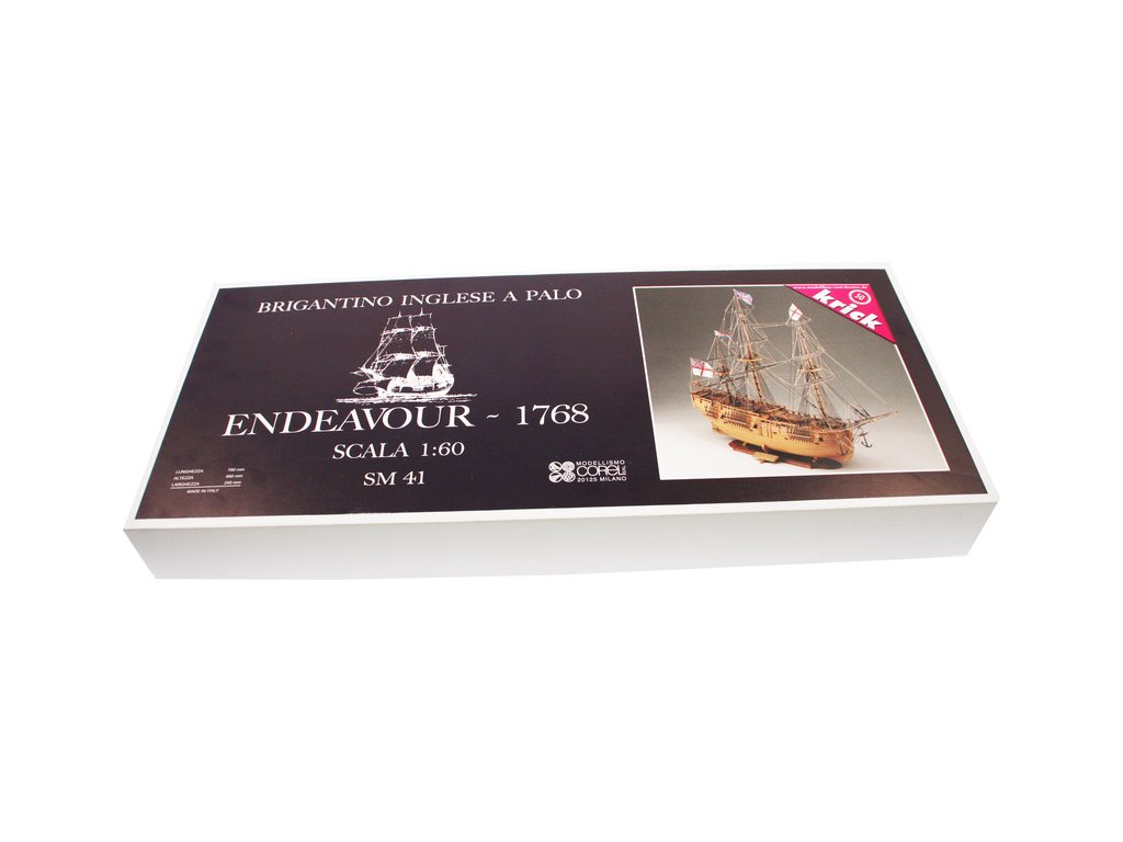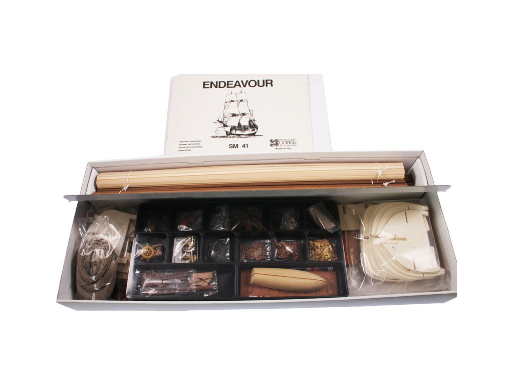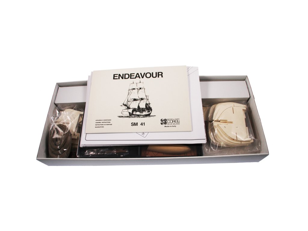 Stavebnice neplovoucího modelu COREL Endeavour v měřítku 1:60 z roku 1768. Loď s kapitánem Cookem v roce 1768 provedla expedici do jižních moří, k pobřeží Austrálie a odvážil se do jižního oceánu. V balení jsou dřevěné díly, lišty a množství kování, příslušenství, plány atd.