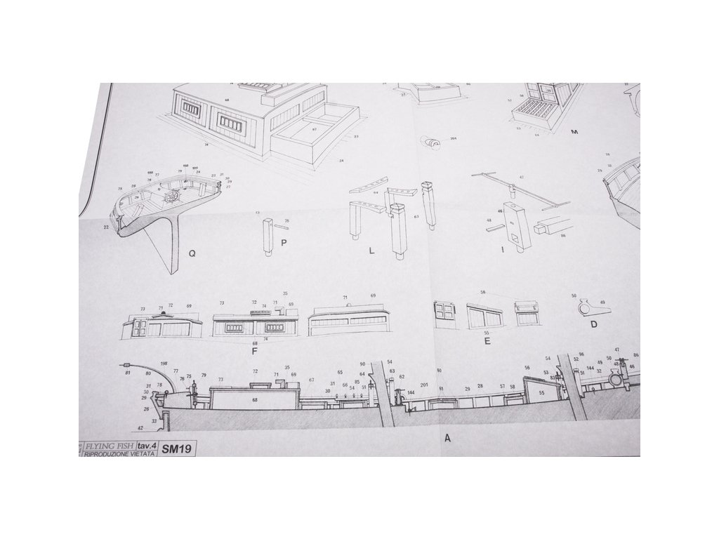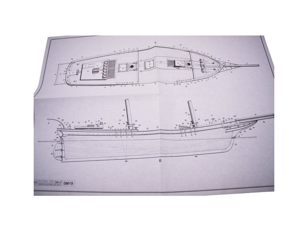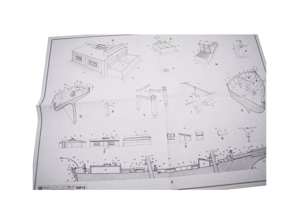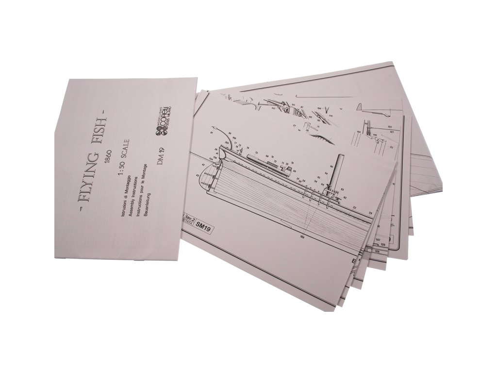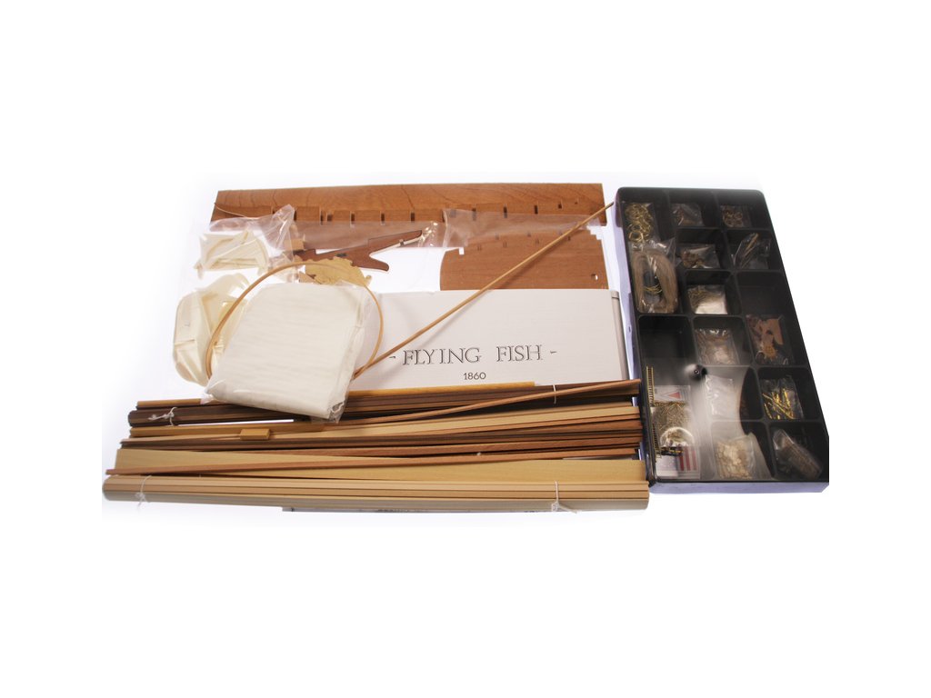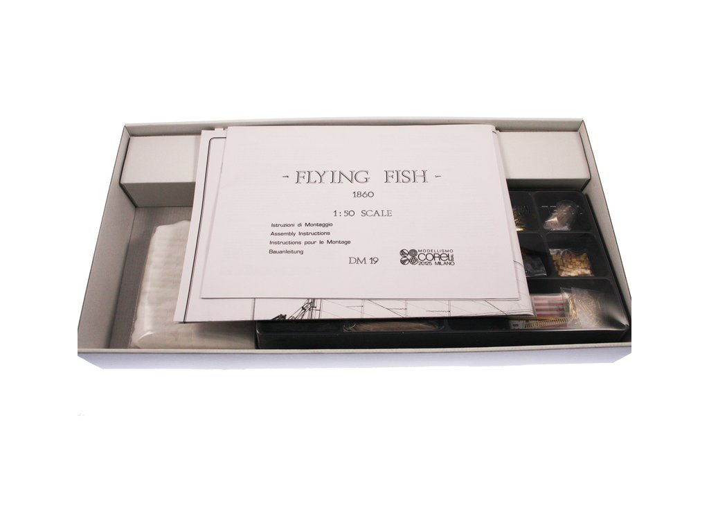 Stavebnice neplovoucího modelu COREL Flying Fish v měřítku 1:50 z roku 1860. Stavitelem lodi byl Jeremiah Burnham, díky elegantnímu štíhlému trupu a velkému plachtoví byla jednou z nejrychlejších dvoustěžňových lodí v rybářské flotile v Gloucesteru. V balení jsou dřevěné díly, lišty a množství kování, lanoví, plachty, plány atd.