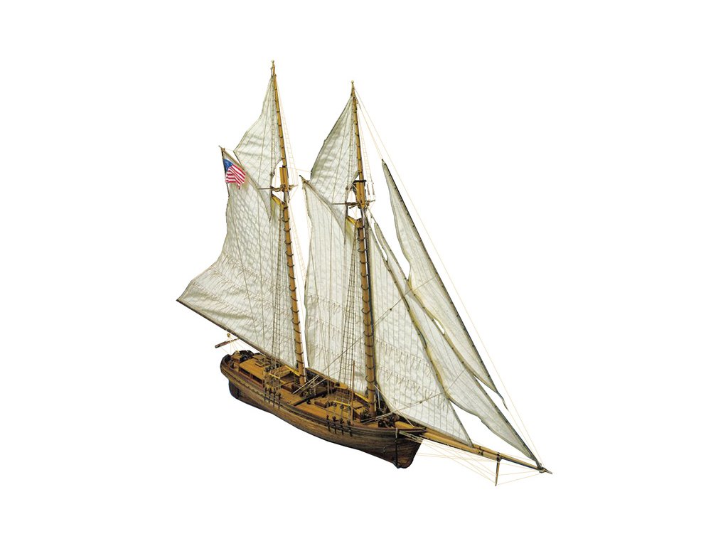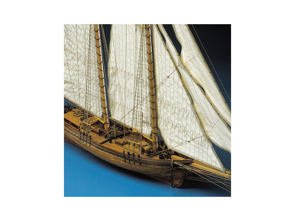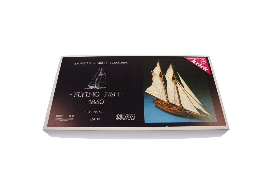 Stavebnice neplovoucího modelu COREL Flying Fish v měřítku 1:50 z roku 1860. Stavitelem lodi byl Jeremiah Burnham, šlo o rybářskou loď, která byla díky elegantnímu štíhlému trupu a velkému plachtoví, jednou z nejrychlejších dvoustěžňových lodí v rybářské flotile v Gloucesteru. V balení jsou dřevěné díly, lišty a množství kování, lanoví, plachty, plány atd.
