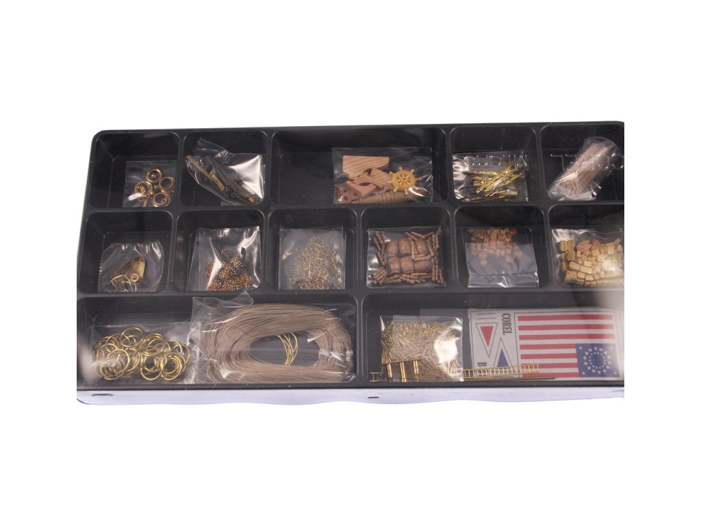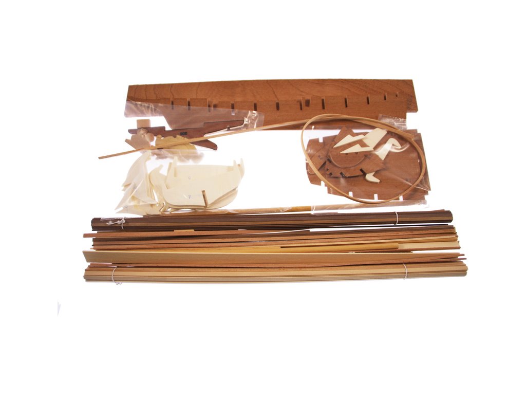 Balení obsahuje sadu překližkových dílů, sadu dřevěných lišt o různém průřezu, blistr s drobnými díly, sadu výkresů a manuál.