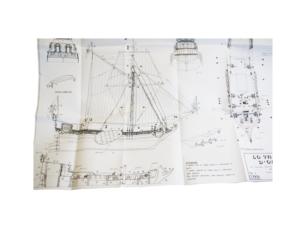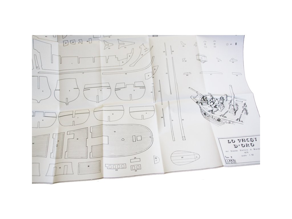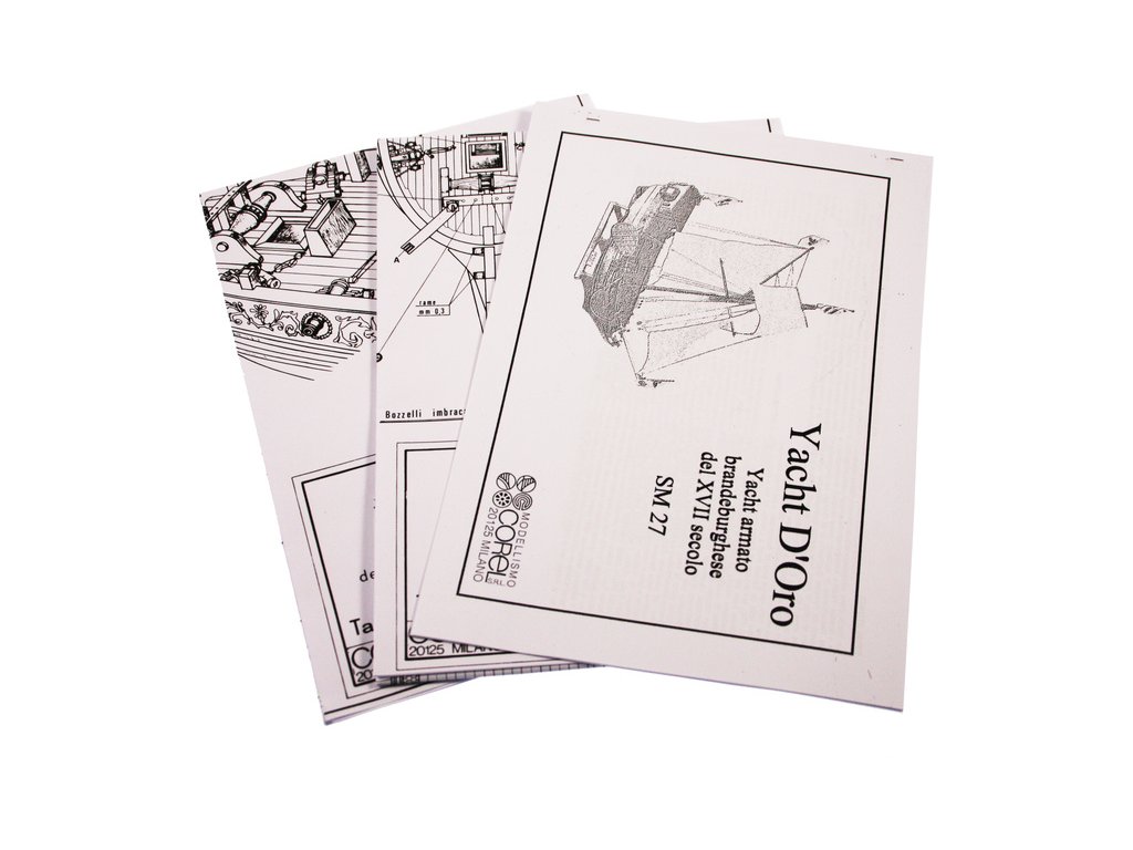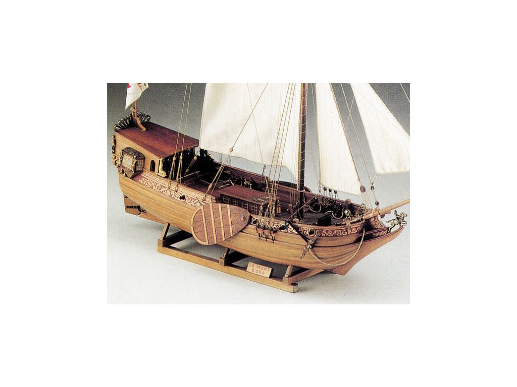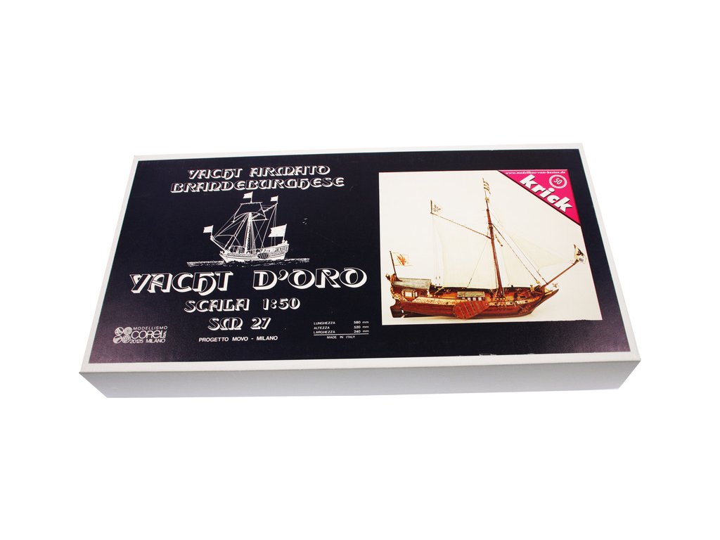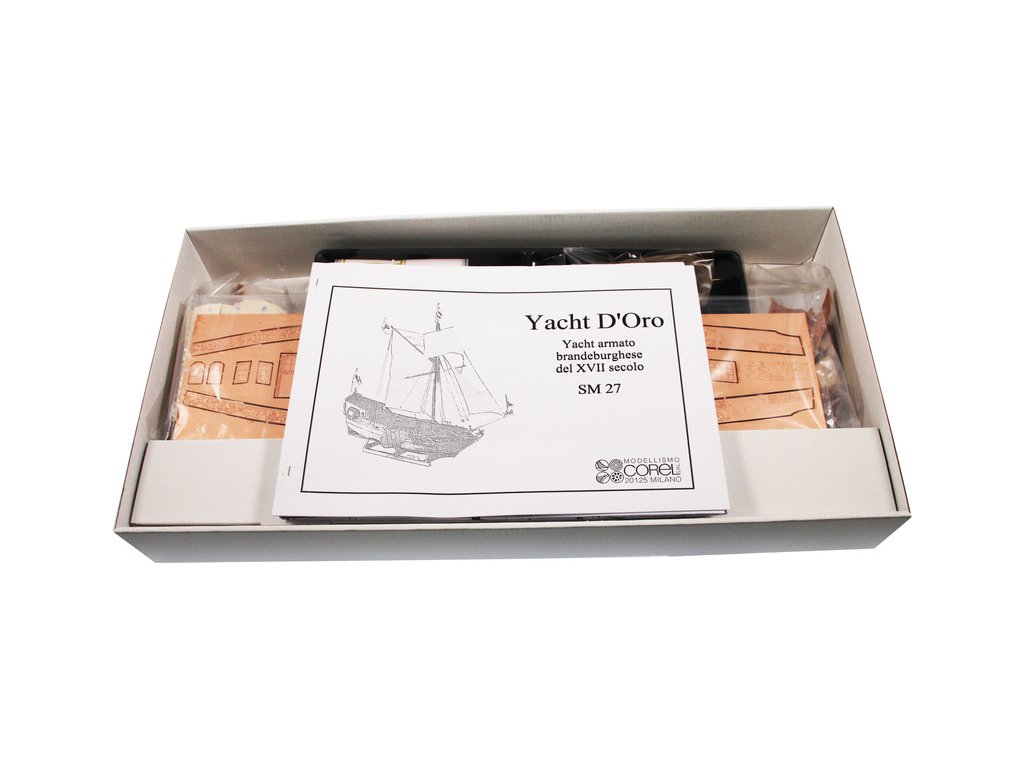 Stavebnice neplovoucího modelu COREL Goldene Jacht v měřítku 1:50 z roku 1700 byla postavena v roce 1679 loděnicí Peckelhering v Kolbergu jako jachta prince Williama III. Jachta byla vyzbrojena 8 děly, posádka 12 mužů. V balení jsou dřevěné díly, lišty a množství kování, lanoví, plátno na plachty, plány atd.