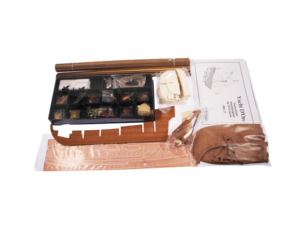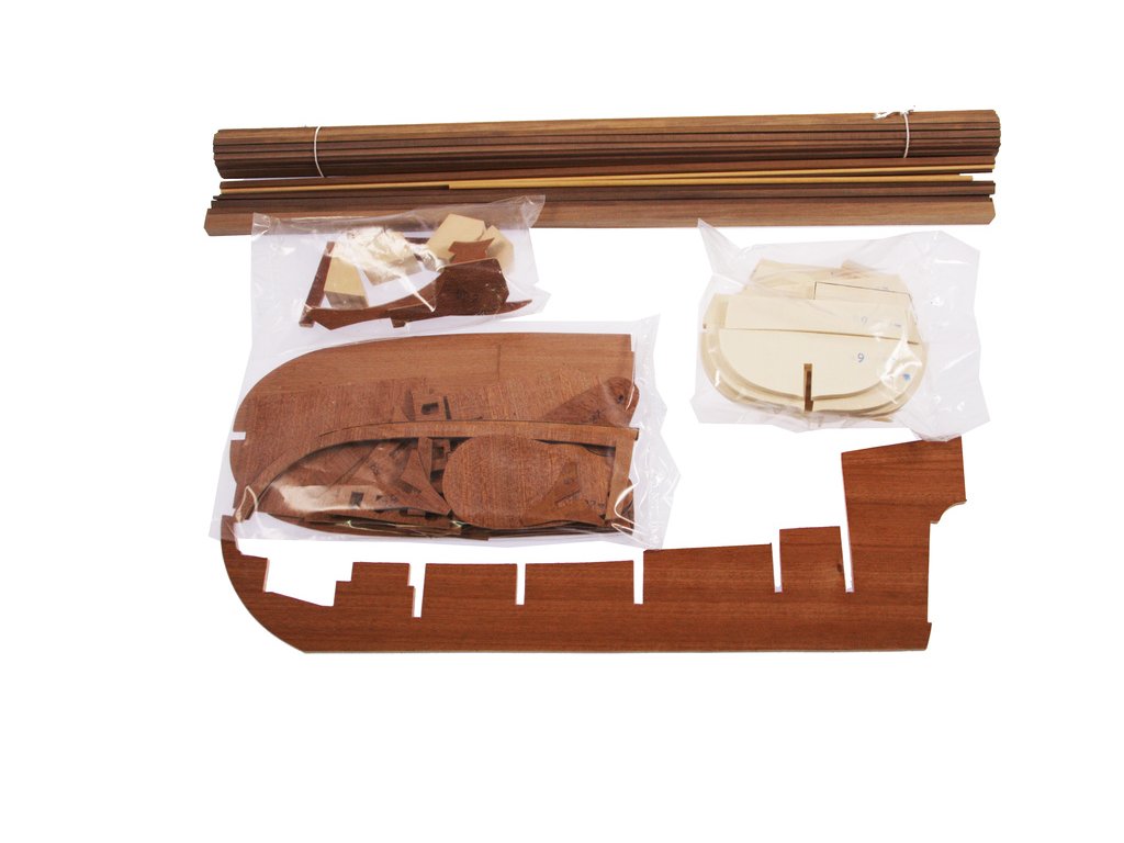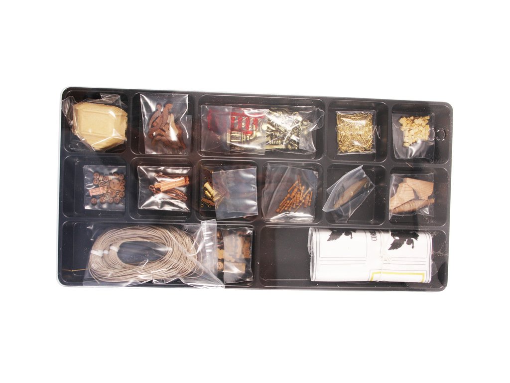 Balení obsahuje sadu překližkových dílů, sadu dřevěných lišt o různém průřezu, blistr s drobnými díly, díly z mosazi, sadu výkresů a vícejazyčný manuál.