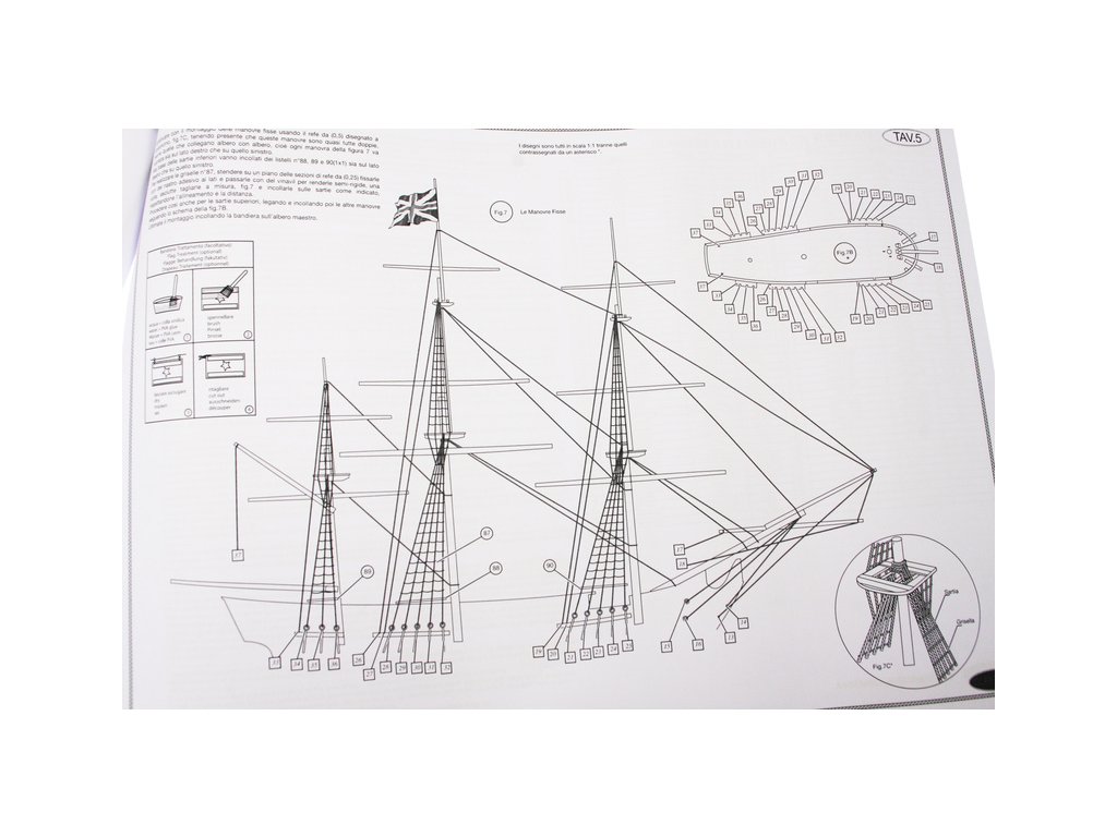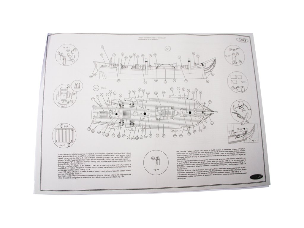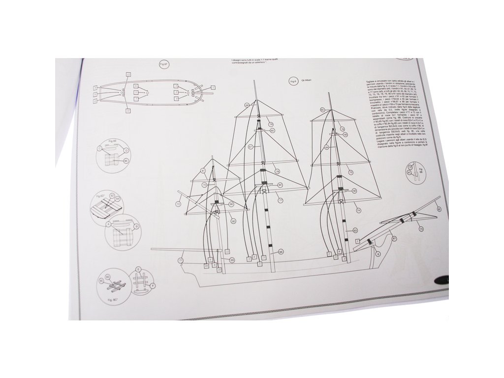 Set obsahuje kompletní sadu výkresové dokumentace modelu v měřítku 1:1 s obrázky jednotlivých detailů. Na výkrese jsou v měřítku nakresleny montážní sestavy, jejich kompletace a to včetně stěžňů a ráhen a způsob vázání lanoví. Vícejazyčný postup stavby rámcově upravuje logické sestavení jednotlivých komponentů.