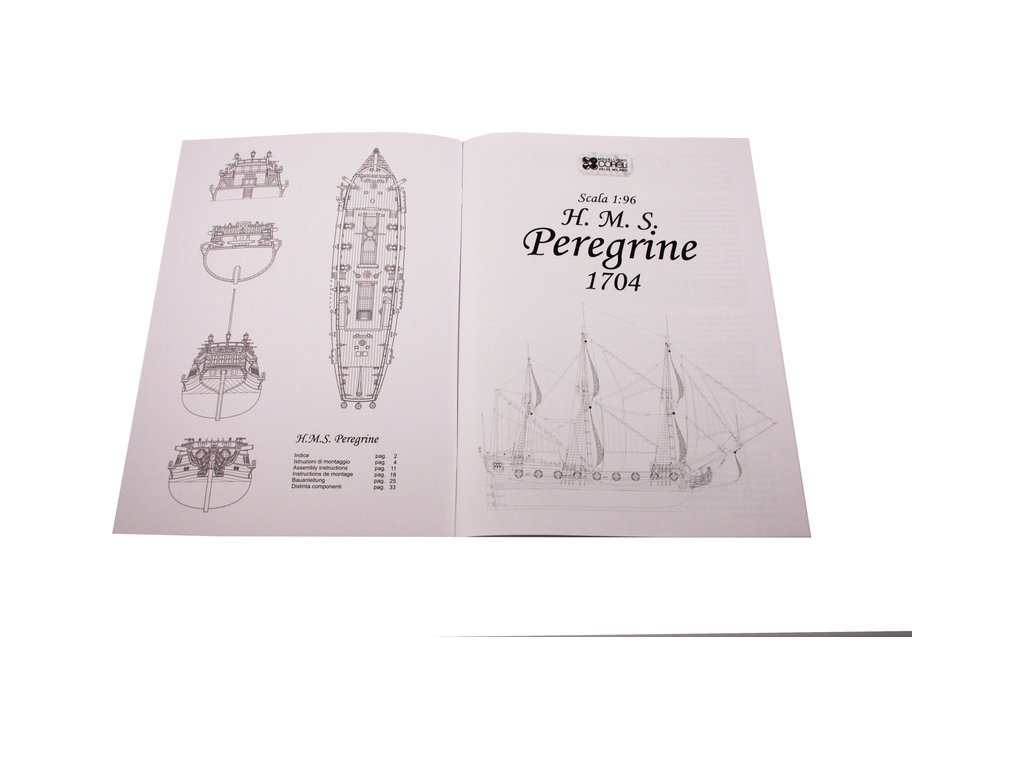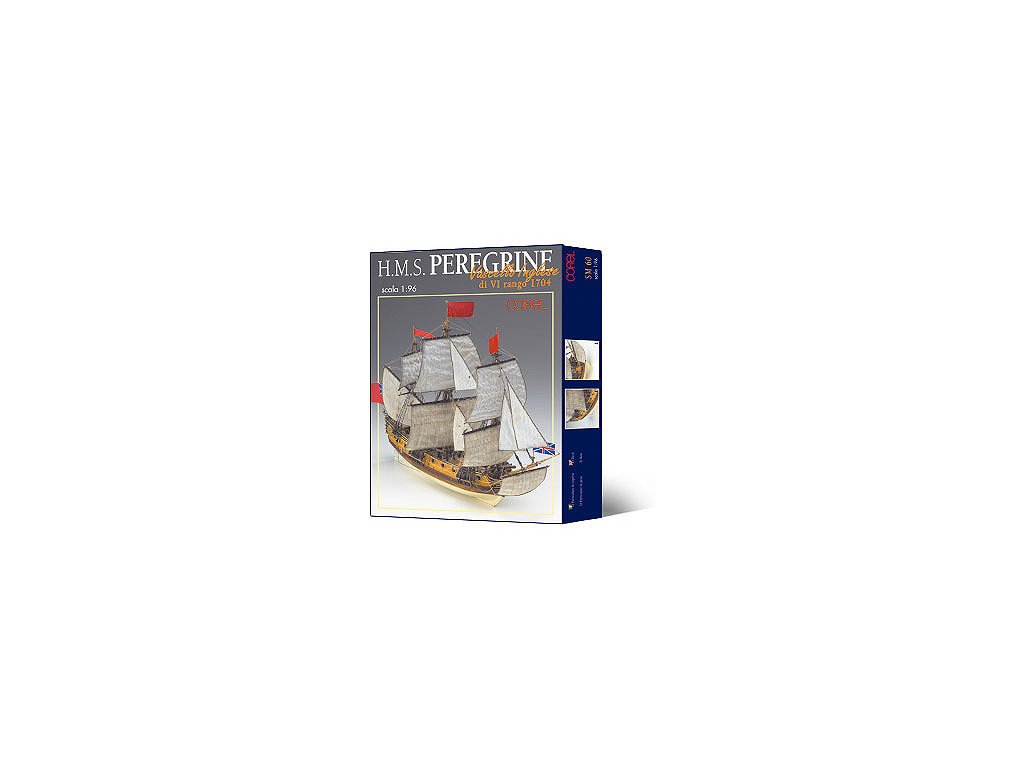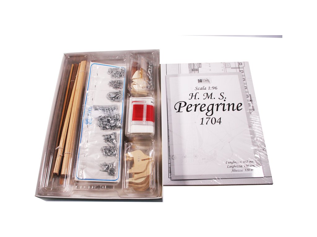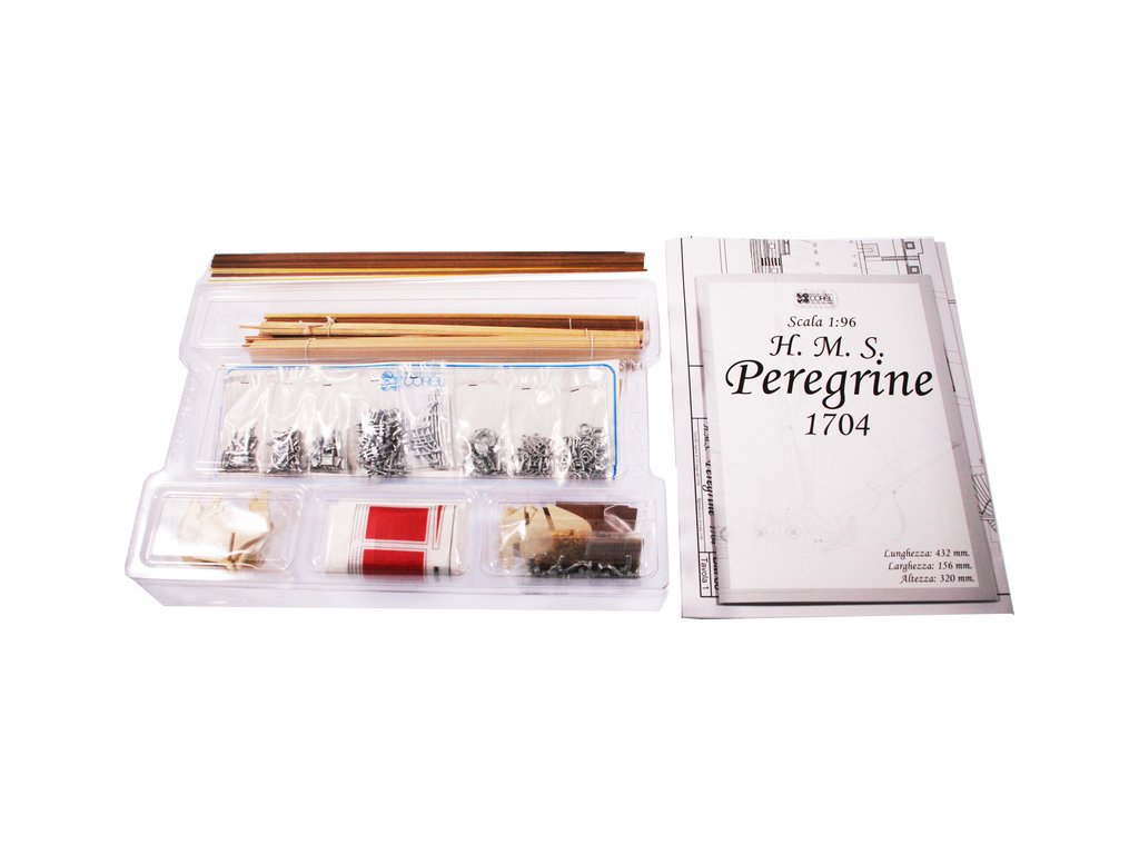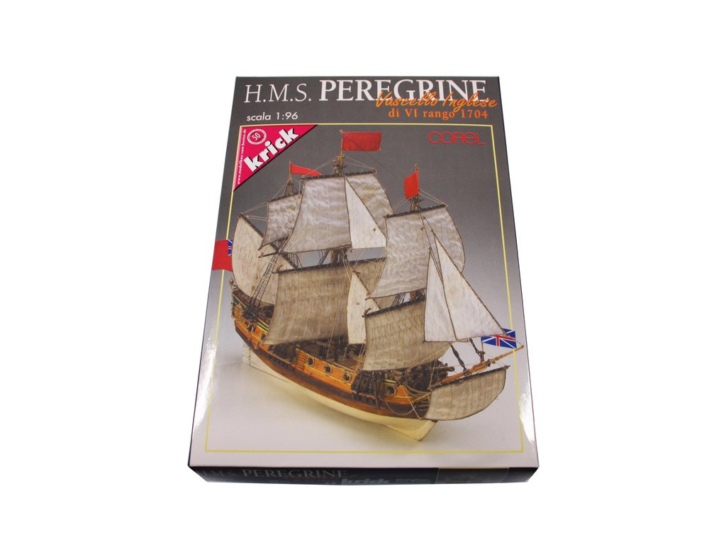 Stavebnice neplovoucího modelu COREL H.M.S. Peregrine v měřítku 1:96 z roku 1749 Kit. H.M.S. (His Majesty's Ship - loď Jeho Veličenstva) byl postaven v roce 1686 pro flotilu krále Jiřího III. Plán je velmi detailní, v balení jsou dřevěné díly, lišty a množství kování, lanoví, plátno na plachty a další.