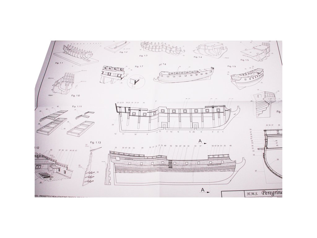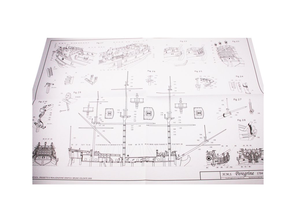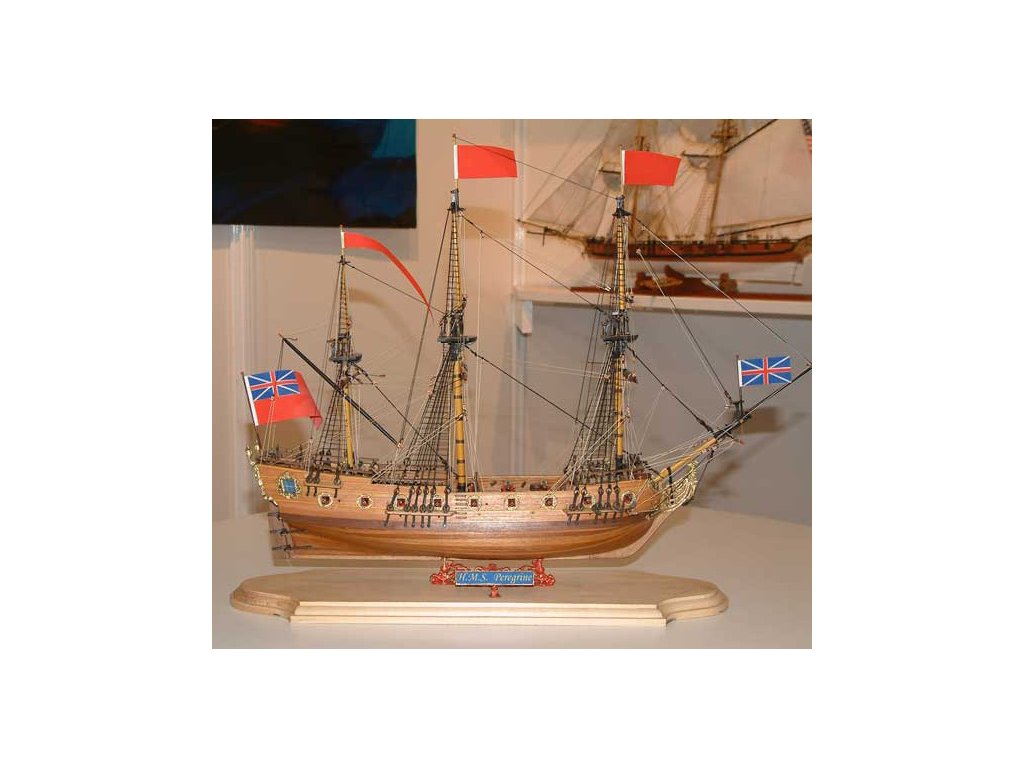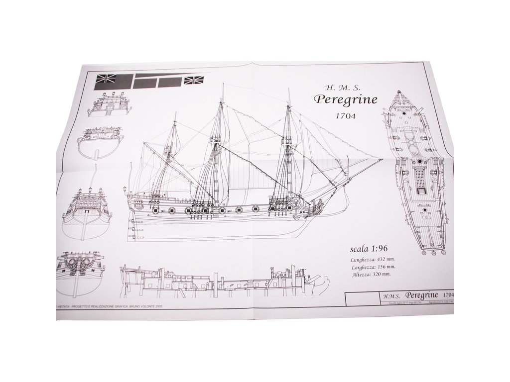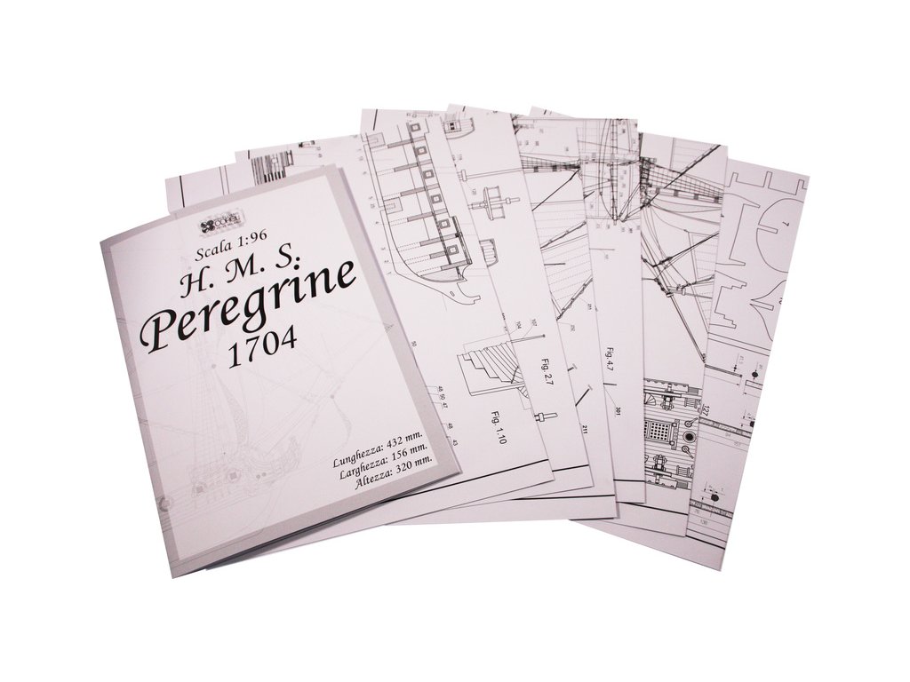 Stavebnice neplovoucího modelu COREL H.M.S. Peregrine v měřítku 1:96 z roku 1749 Kit. H.M.S. (His Majesty's Ship - loď Jeho Veličenstva) byl postaven v roce 1686 pro flotilu krále Jiřího III. Plán je velmi detailní, v balení jsou dřevěné díly, lišty a množství kování, lanoví, plátno na plachty a další.