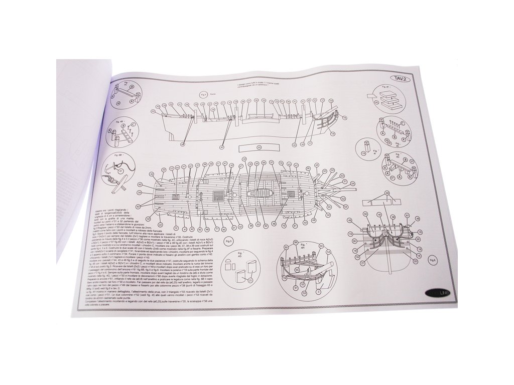 Balení obsahuje sadu překližkových dílů, sadu dřevěných lišt o různém průřezu, blistr s drobnými díly, sadu výkresů a manuál anglický, německý, francouzský a italský.