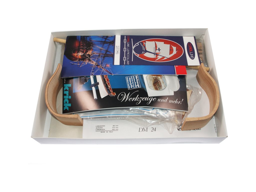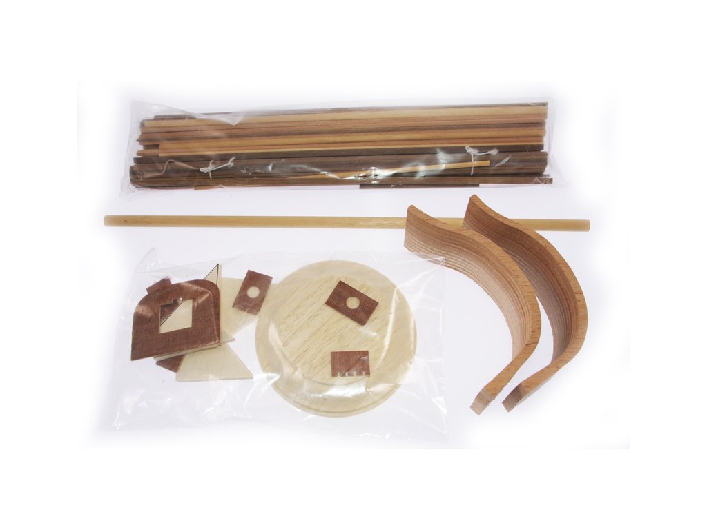 Balení obsahuje sadu překližkových dílů, sadu dřevěných lišt o různém průřezu, blistr s drobnými díly, sadu výkresů a manuál.