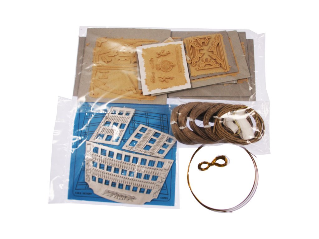 Balení obsahuje sadu překližkových dílů, sadu dřevěných lišt o různém průřezu, sáčky s drobnými díly, díly z mosazi a kovu, sadu výkresů a vícejazyčný manuál.