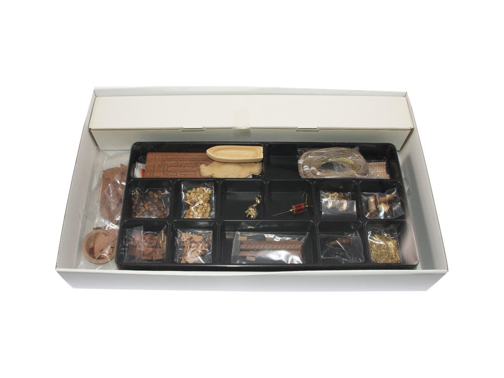 Balení obsahuje sadu překližkových dílů, sadu dřevěných lišt o různém průřezu, blistr s drobnými díly, sadu výkresů a anglický manuál.
