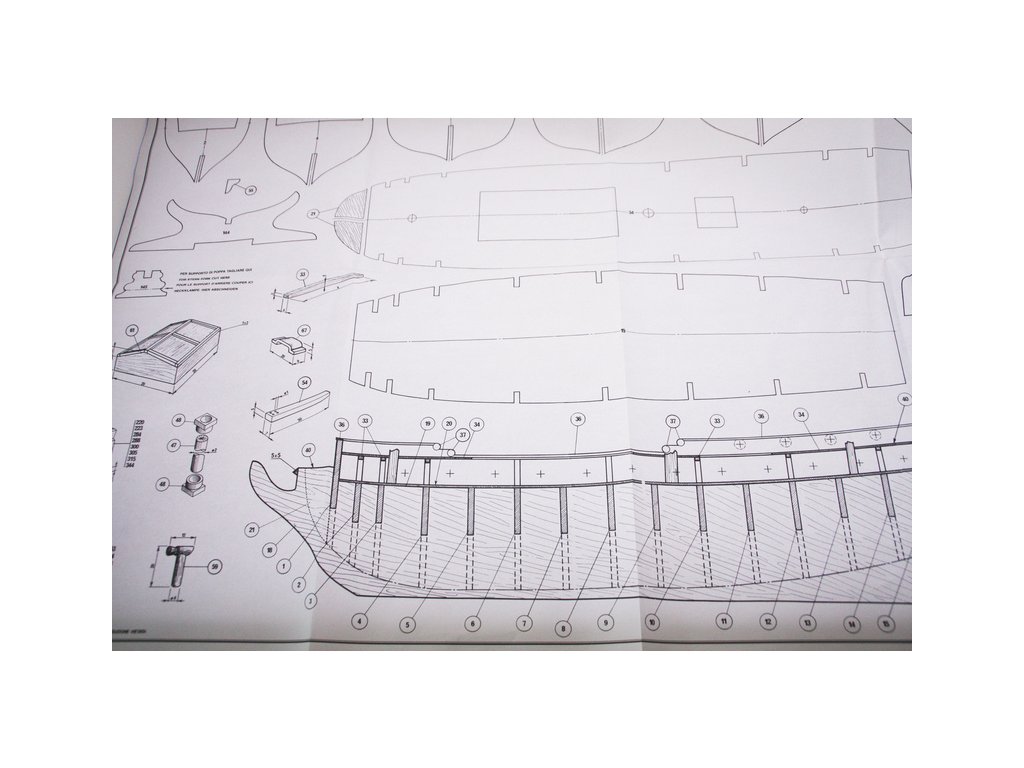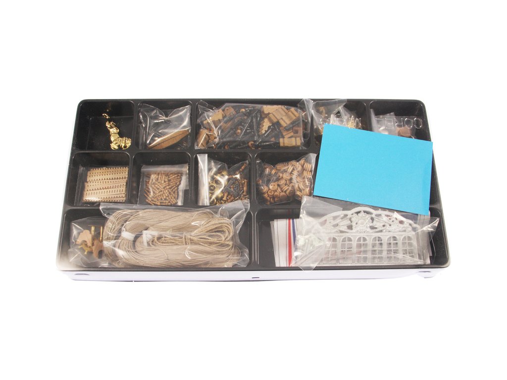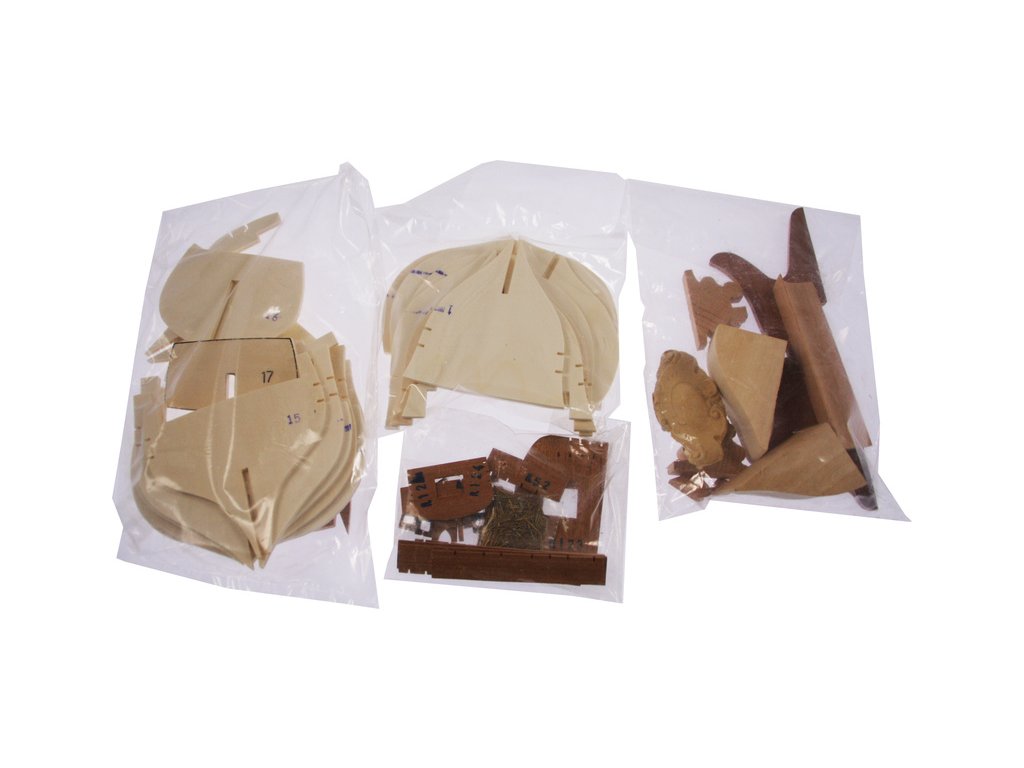 Balení obsahuje sadu překližkových dílů, sadu dřevěných lišt o různém průřezu, blistr s drobnými díly, sadu výkresů a manuál anglický, německý, francouzský a italský.