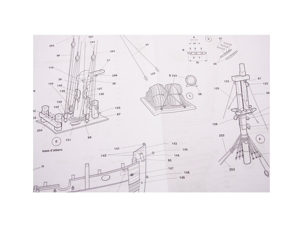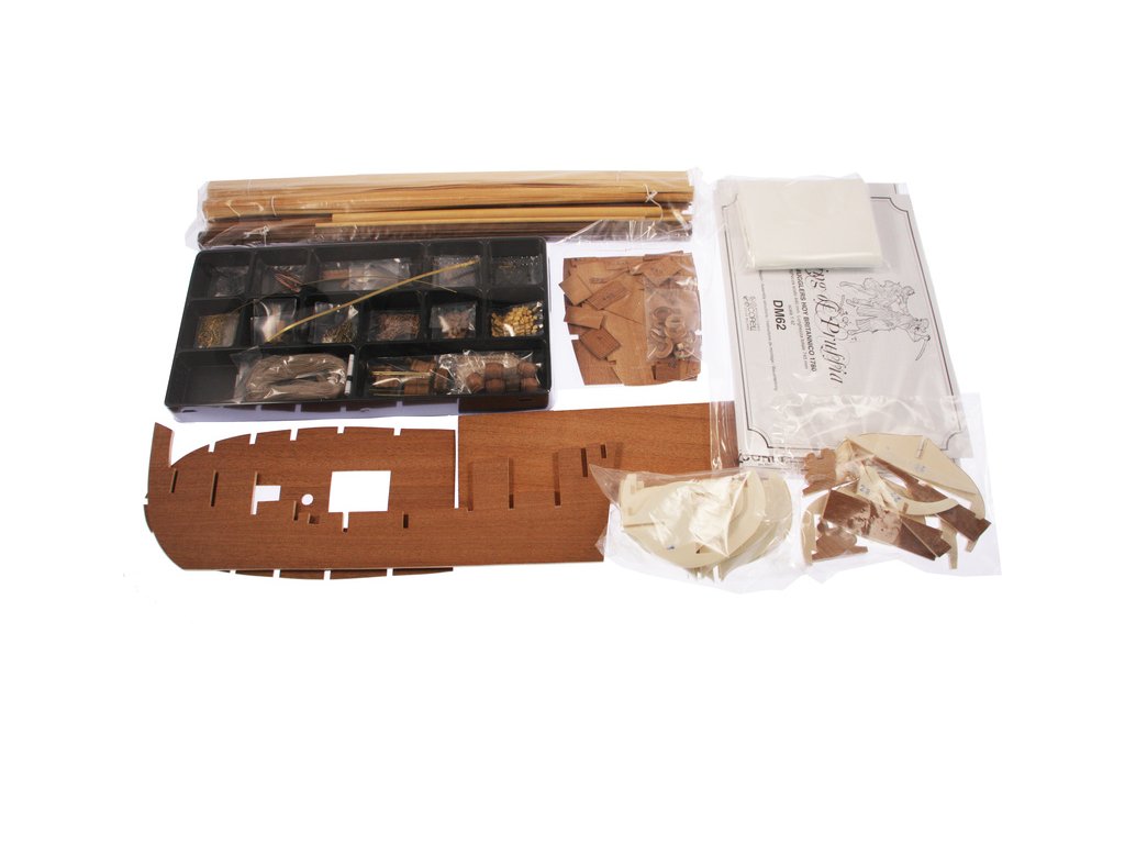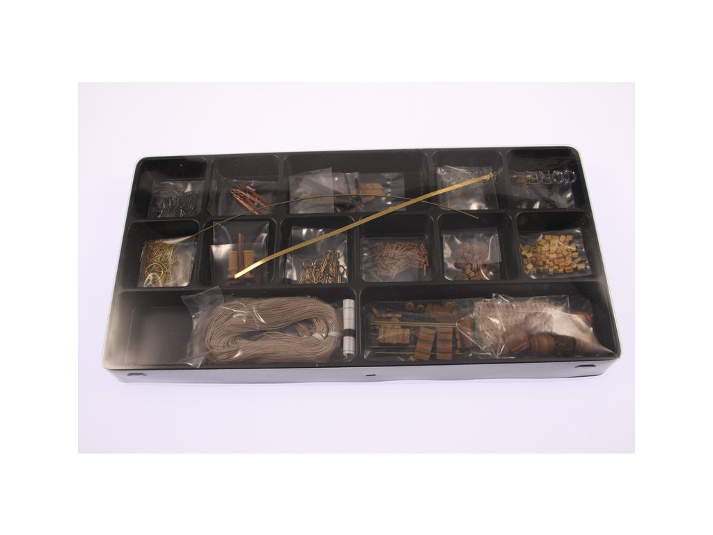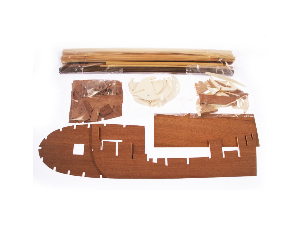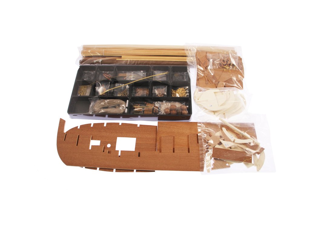 Balení obsahuje sadu překližkových dílů, sadu dřevěných lišt o různém průřezu, blistr s drobnými díly, sadu výkresů, český návod a vícejazyčný manuál.