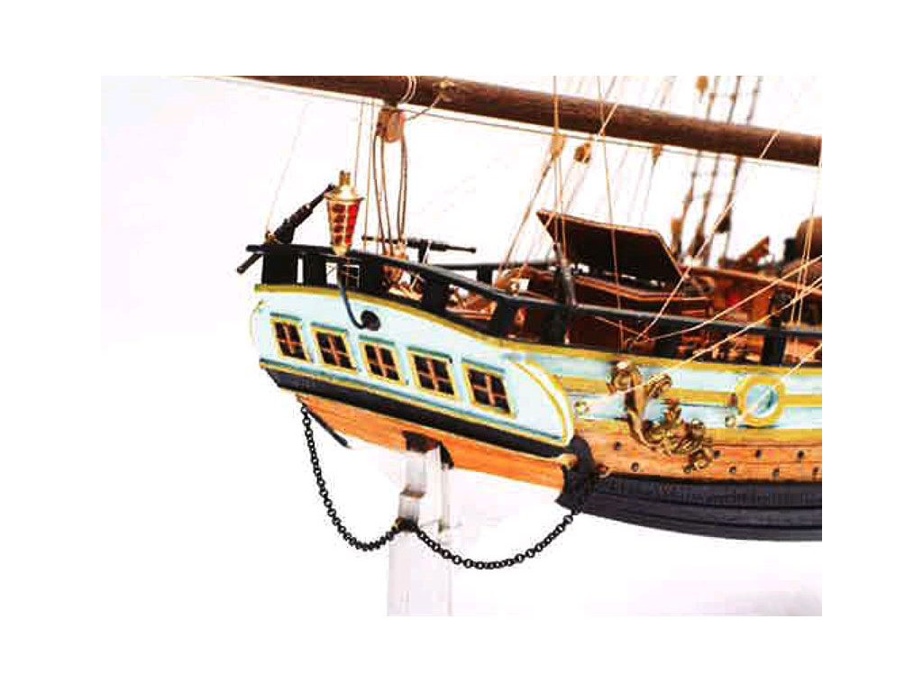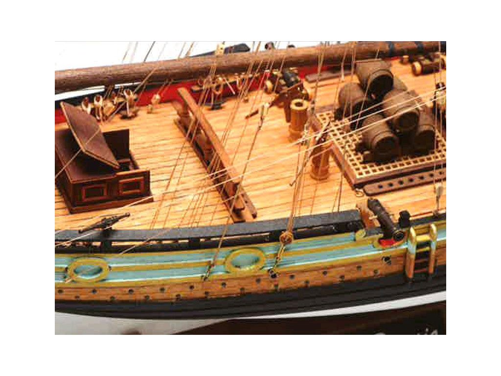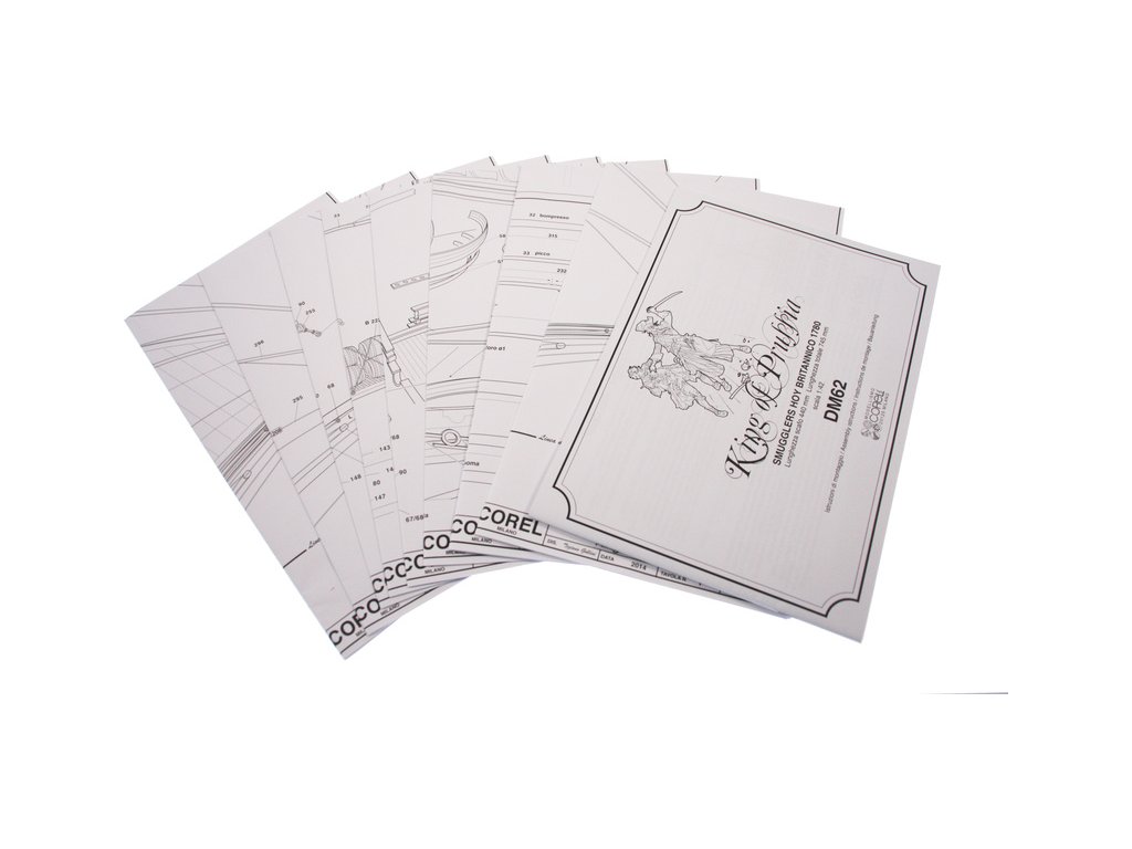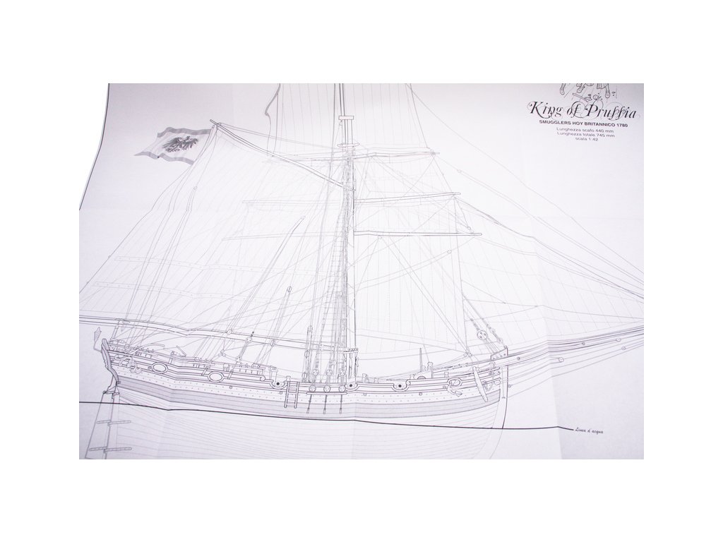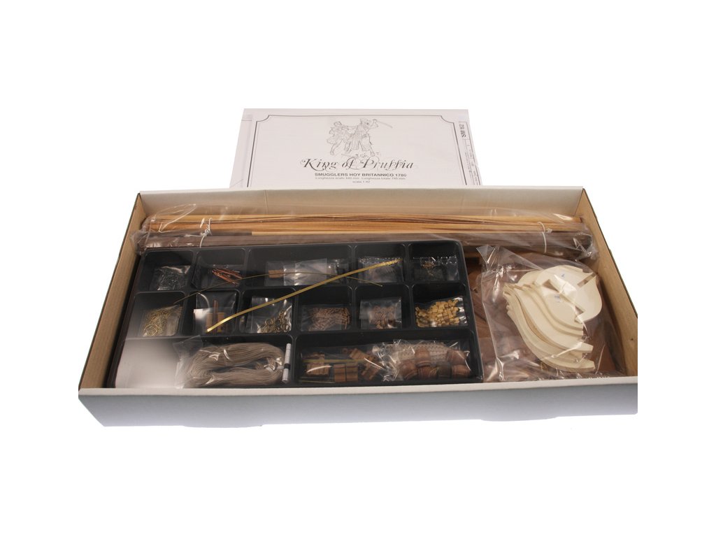 Stavebnice neplovoucího modelu COREL King of Prussia v měřítku 1:42 z roku 1777, se kterou se slavný pašerák John Carter plavil po vodách jižní Anglie. Loď byla z lehké borovice, velmi rychlá a měla malý ponor. Český manuál. V balení jsou dřevěné díly, lišty a množství kování, lanoví, plátno na plachty a další.