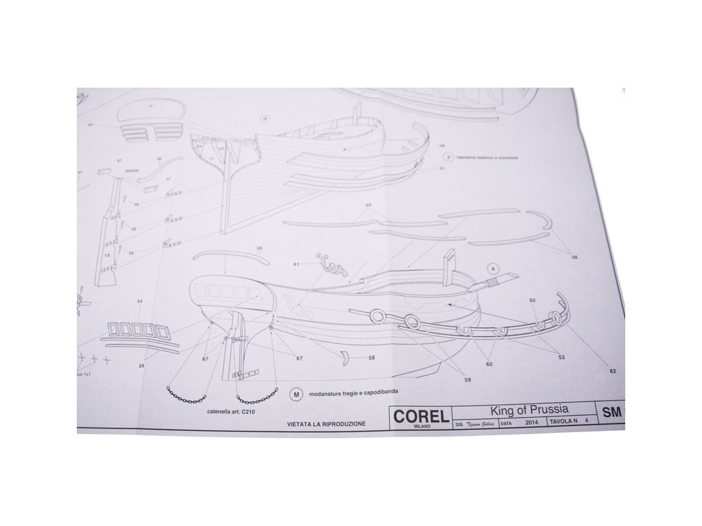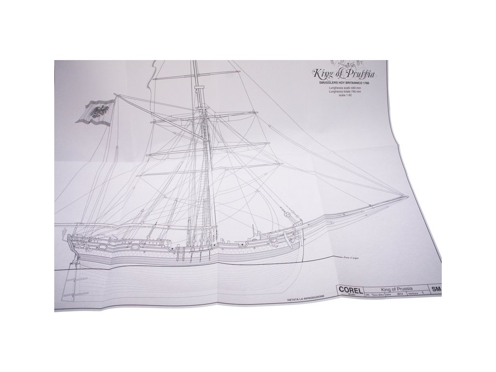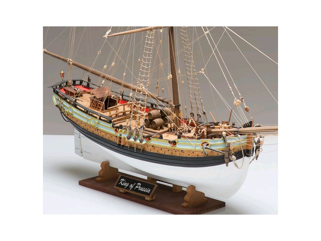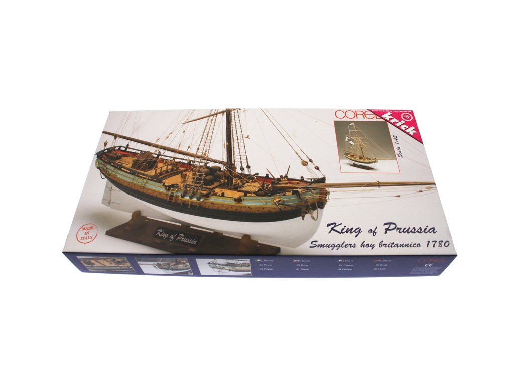 Stavebnice neplovoucího modelu COREL King of Prussia v měřítku 1:42 z roku 1777. Král Pruska byla lodí, se kterou se slavný pašerák John Carter plavil po vodách jižní Anglie. Loď byla vyrobena z lehké borovice, byla velmi rychlá a malý ponor. V balení jsou dřevěné díly, lišty a množství kování, lanoví, plátno na plachty a další.
