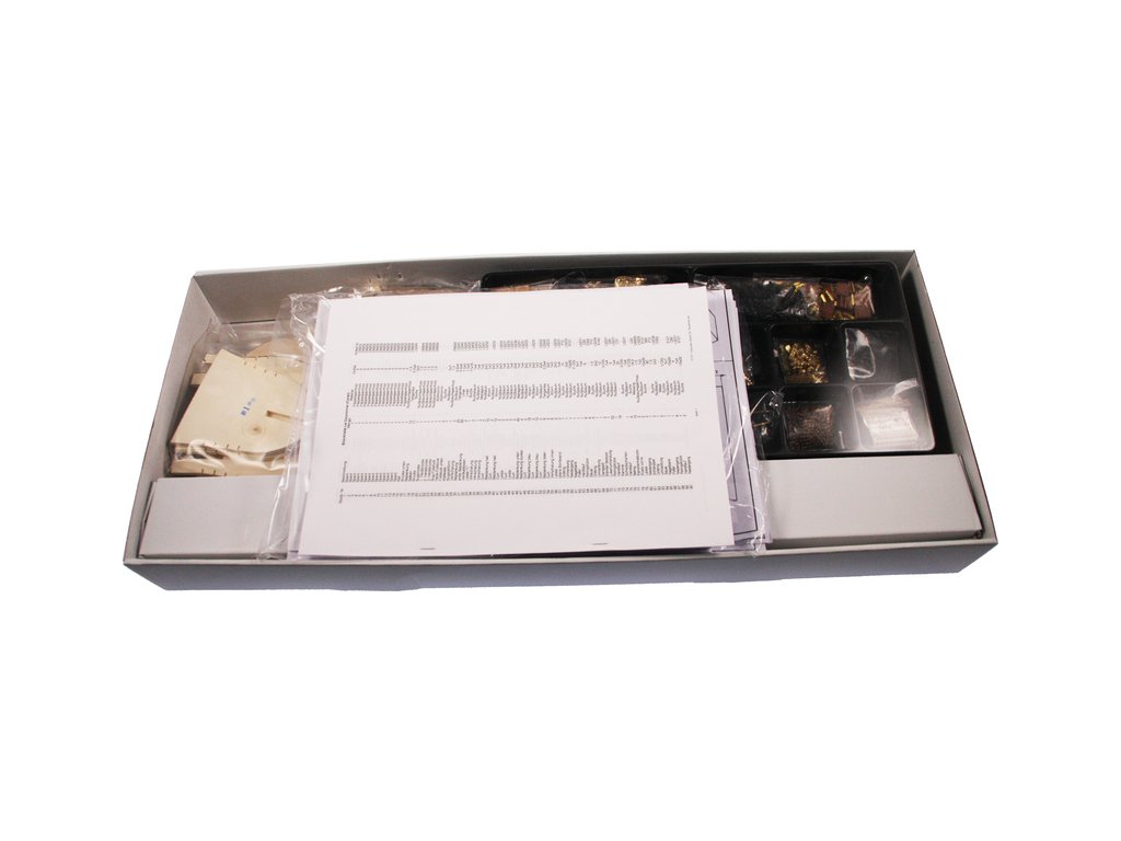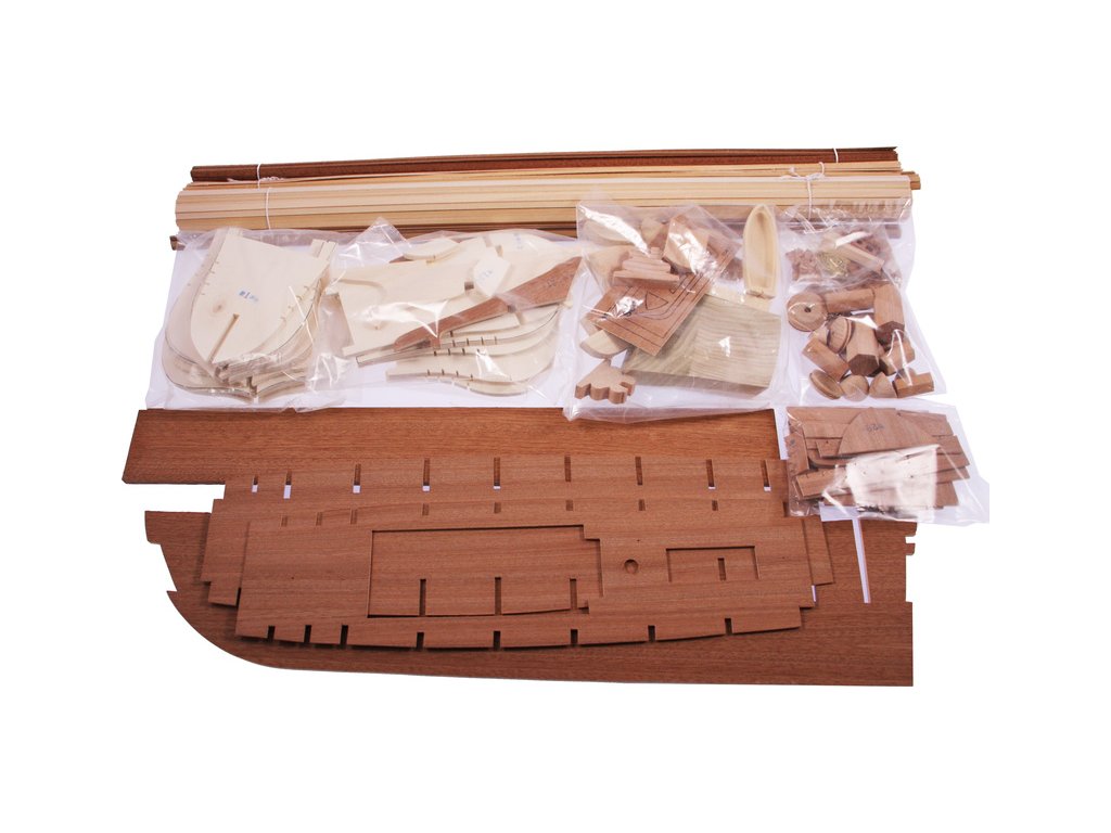 Balení obsahuje sadu překližkových dílů, sadu dřevěných lišt o různém průřezu, blistr s drobnými díly, díly z mosazi, sadu výkresů a vícejazyčný manuál.