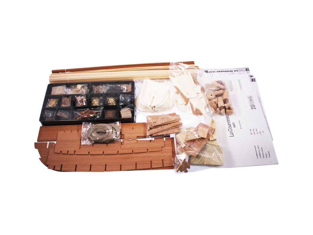 Stavebnice neplovoucího modelu COREL La Couronne v měřítku 1:100 z roku 1636. Kardinálu Richelieu se podařilo sjednotit konkurenční přístavní města Francie a připravit loďařský program jako přípravu na střet s Angličany a Španěly. V balení jsou dřevěné díly, lišty a množství kování, příslušenství, plány atd.