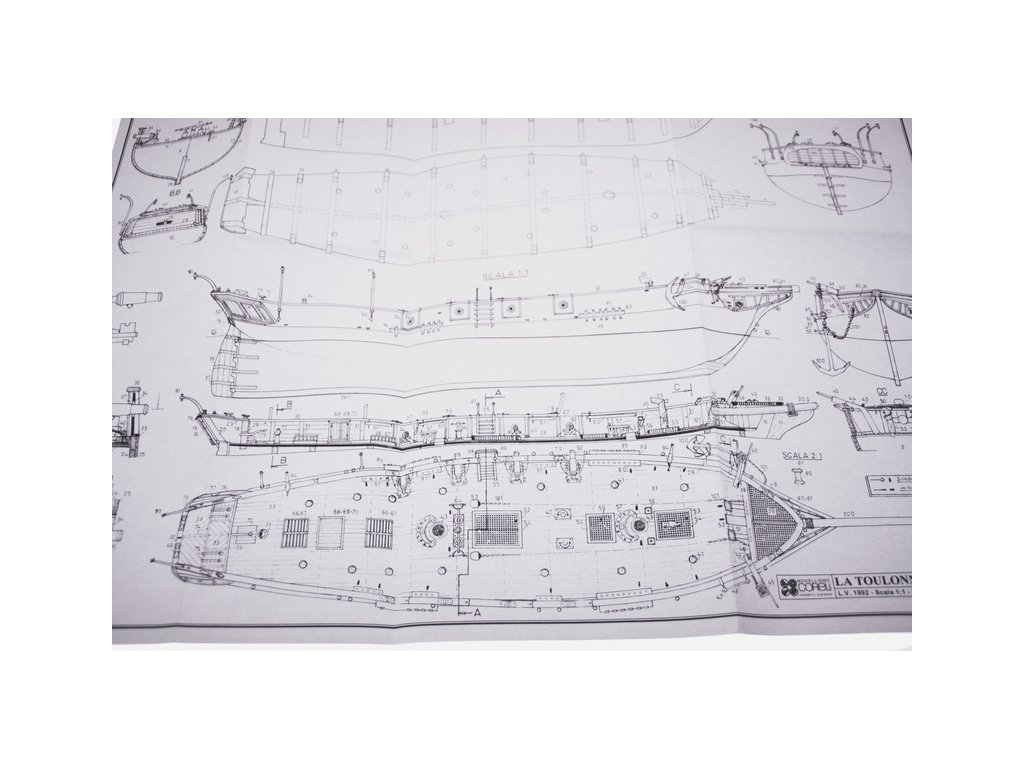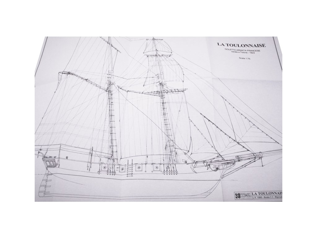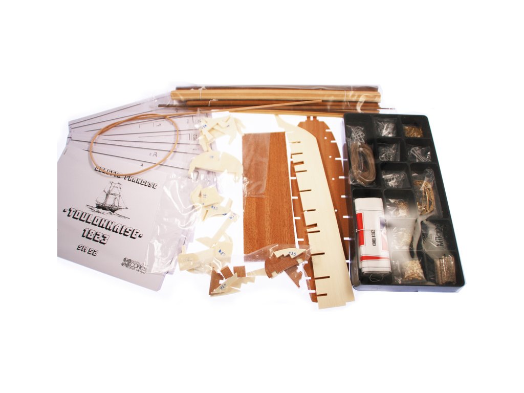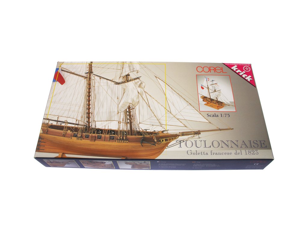 Stavebnice neplovoucího modelu COREL La Toulonnaise v měřítku 1:75 z roku 1823. Francouzský škuner z roku 1823, který se zúčastnil války proti Španělsku. V balení jsou dřevěné díly, lišty a množství kování, lanoví, plátno na plachty, plány atd.