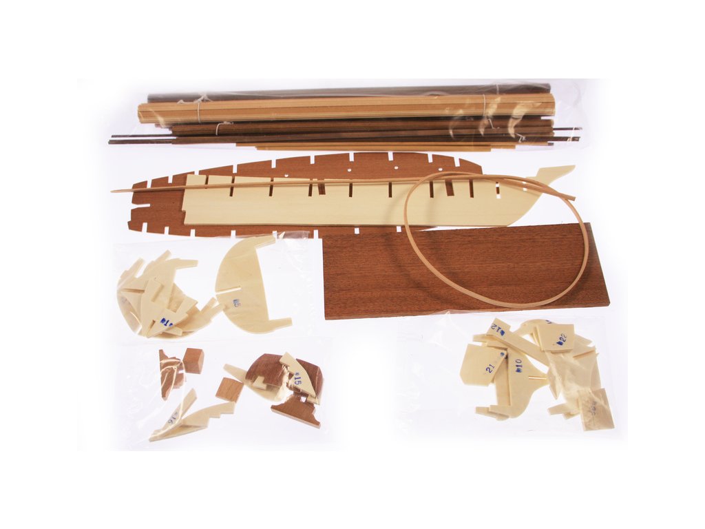 Balení obsahuje sadu překližkových dílů, sadu dřevěných lišt o různém průřezu, blistr s drobnými díly, sadu výkresů a manuál.
