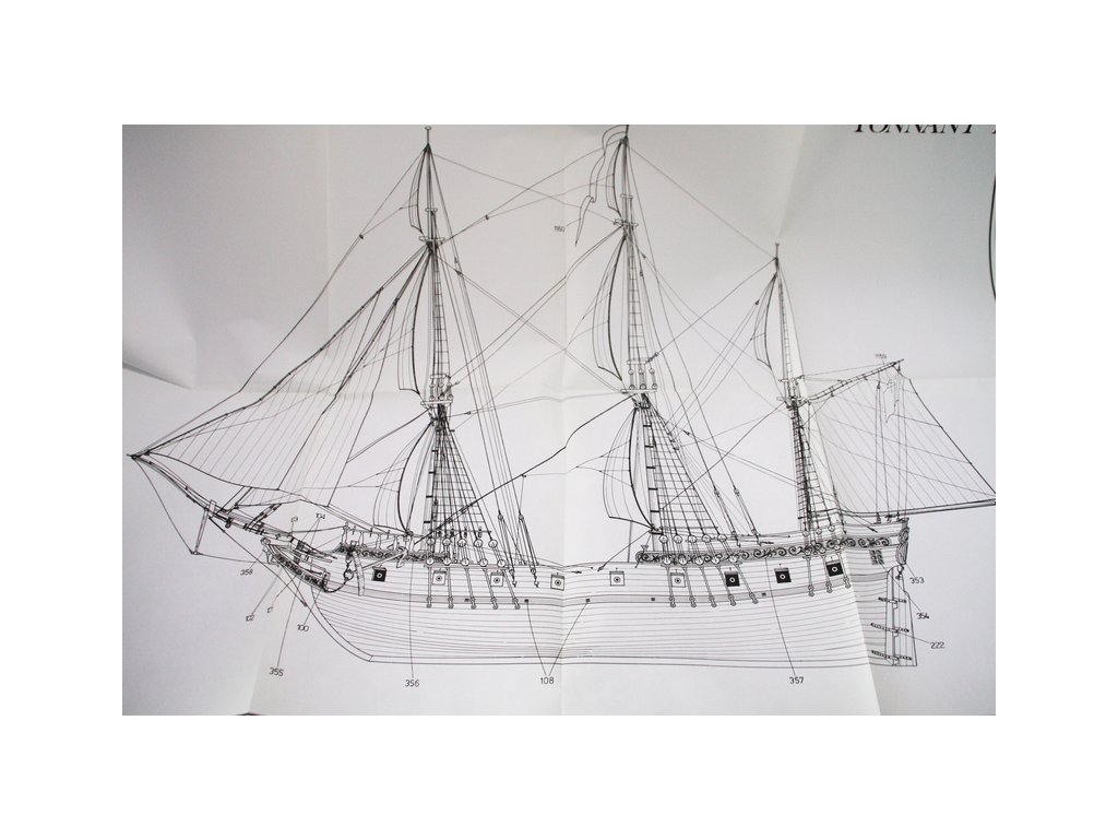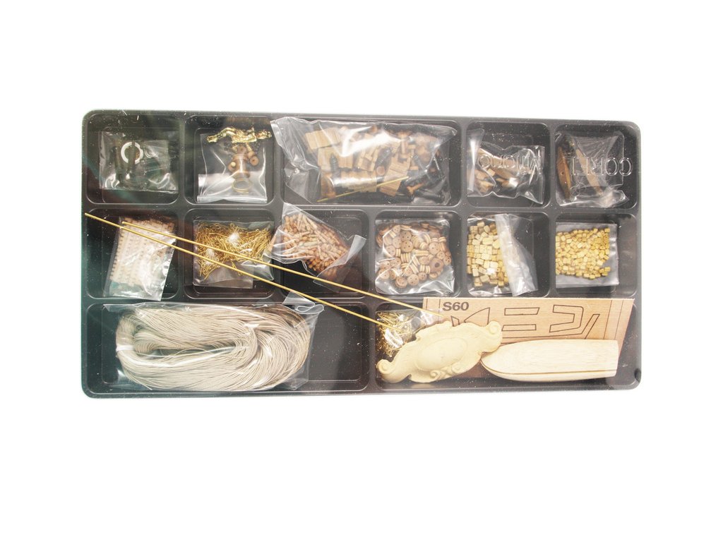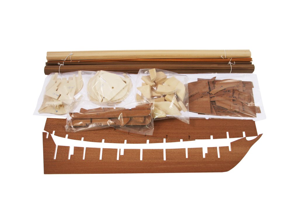 Balení obsahuje sadu překližkových dílů, sadu dřevěných lišt o různém průřezu, blistr s drobnými díly, díly z mosazi, vlajky, sadu výkresů a vícejazyčný manuál.