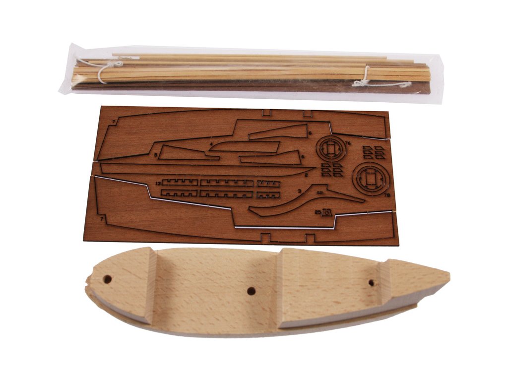 Balení obsahuje sadu překližkových dílů, sadu dřevěných lišt o různém průřezu, sáček s drobnými díly, sadu výkresů a vícejazyčný manuál.