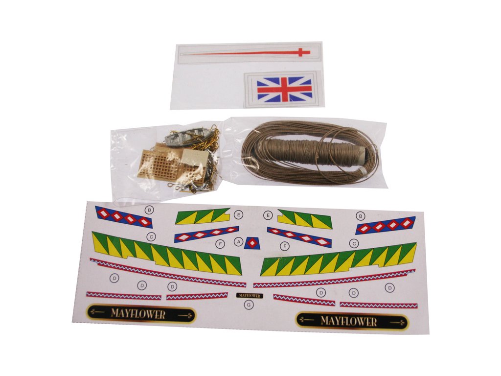 Stavebnice neplovoucího modelu COREL Mayflower v měřítku 1:140 z roku 1609. Mayflower posloužila anglickým puritánům, na cestě do nového světa v roce 1620. V balení jsou dřevěné díly, lišty a množství kování, příslušenství, plány atd.