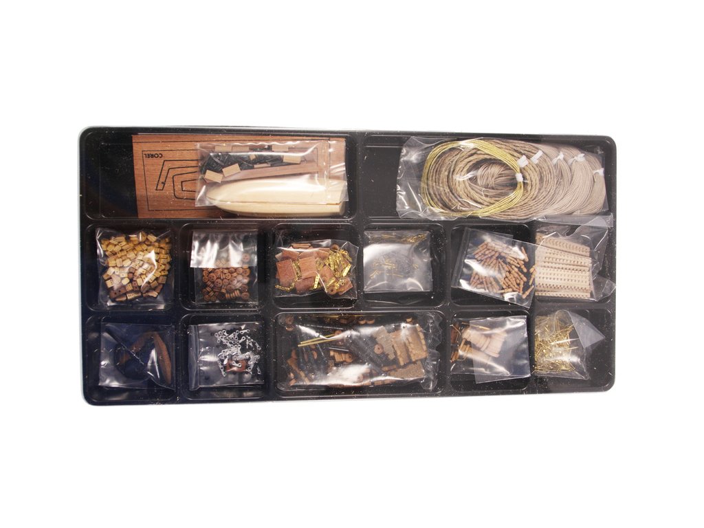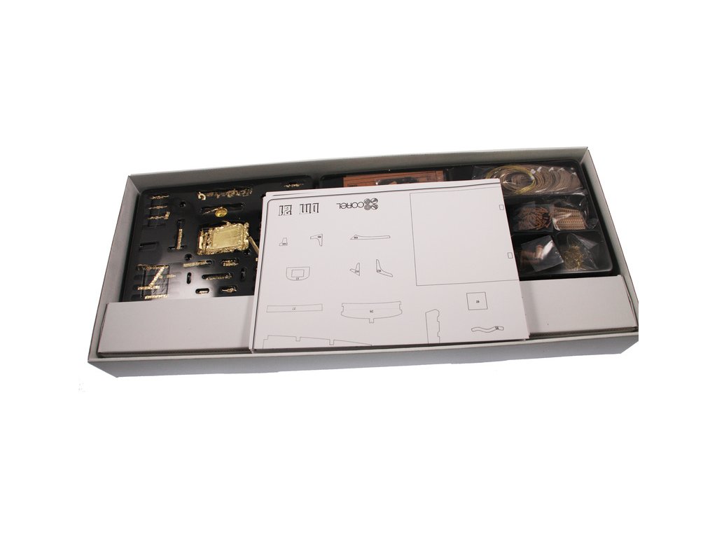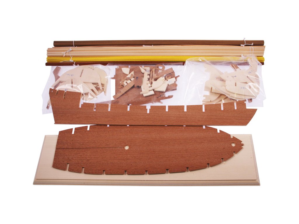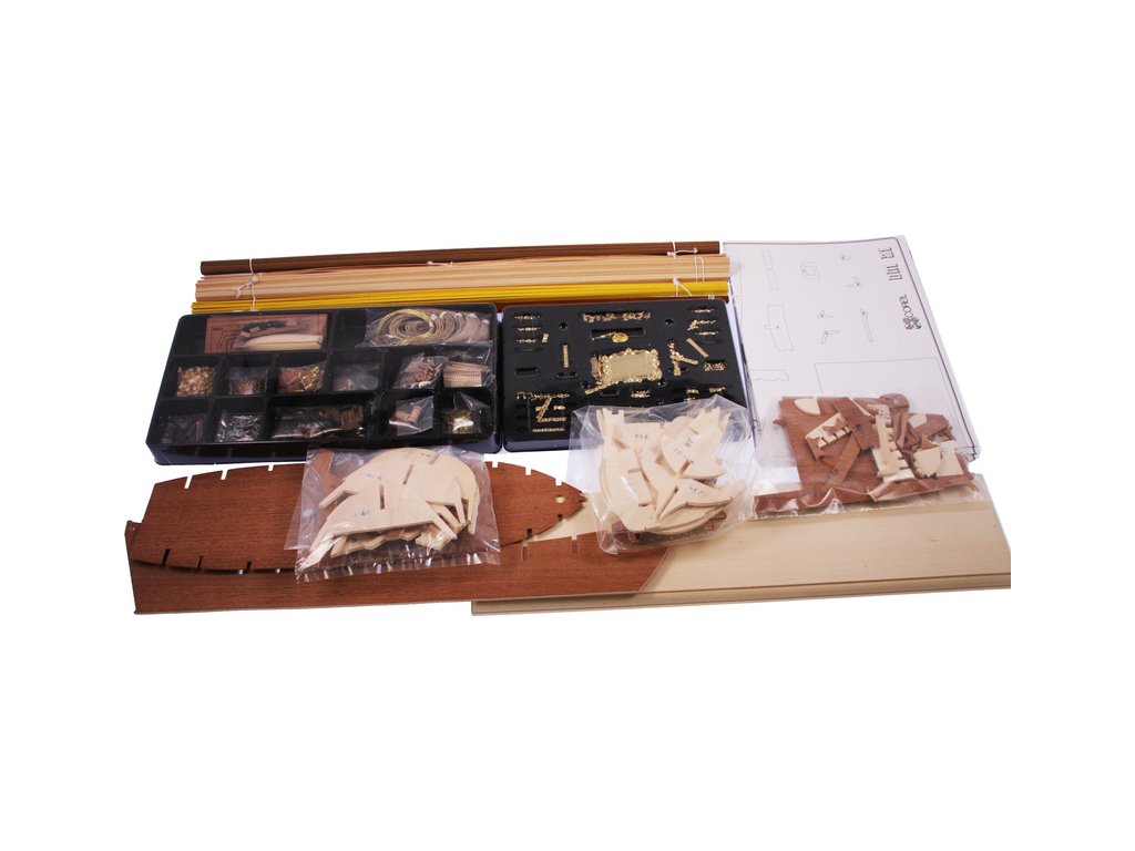 Balení obsahuje sadu překližkových dílů, sadu dřevěných lišt o různém průřezu, blistr s drobnými díly, díly z mosazi, sadu výkresů a vícejazyčný manuál.