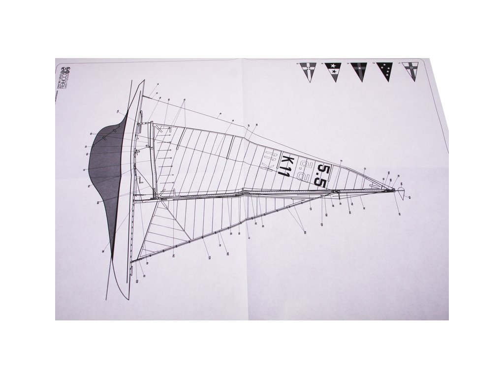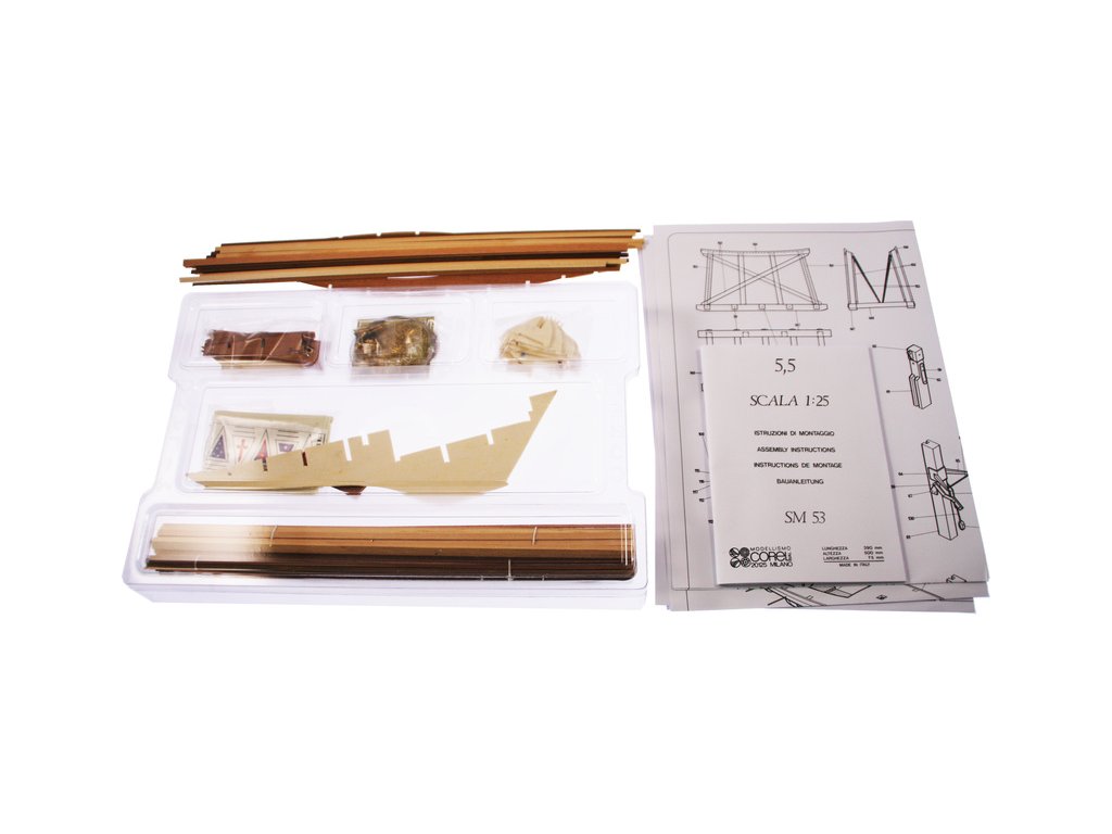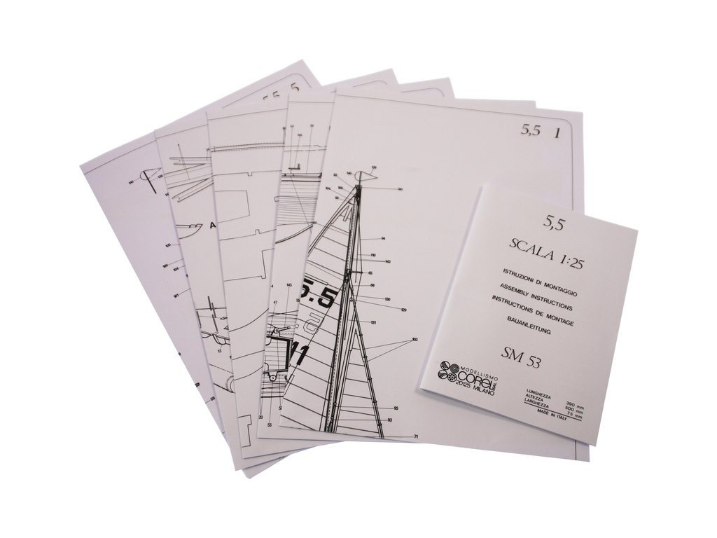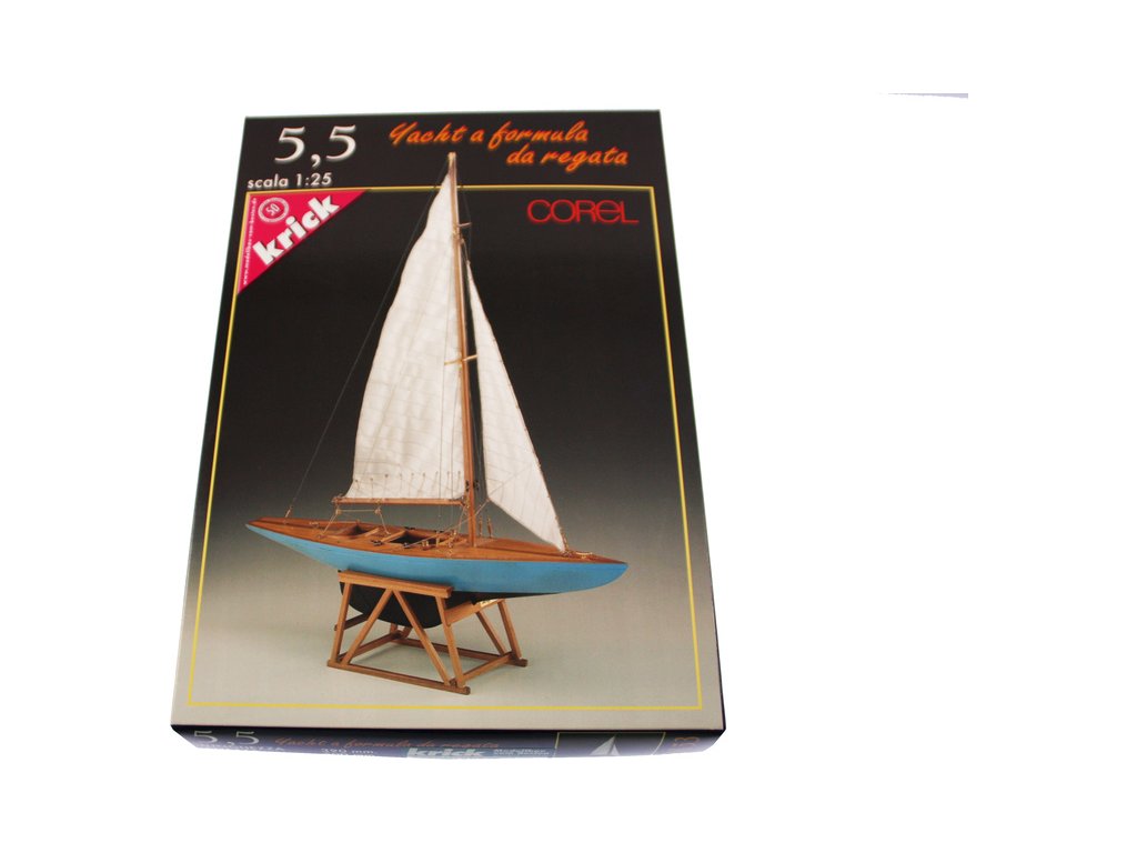 Neplovoucí model COREL S.I. 5.5m plachetnice 1:25 kit je stavebnice závodní jachty třídy 5,5m, na mezinárodních soutěžích "Formule". Třída 5,5 m byla zřízena v roce 1949. Plán je velmi detailní, v balení jsou dřevěné díly, lišty a množství kování, lanoví, plátno na plachty, příslušenství.