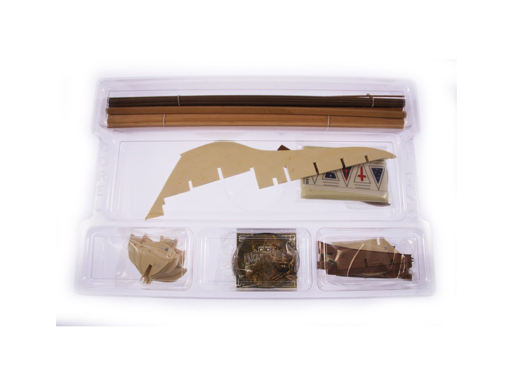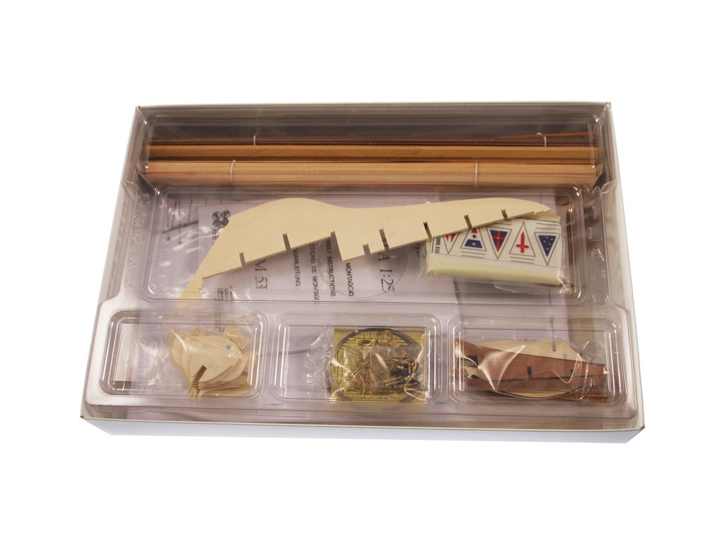 Balení obsahuje sadu překližkových dílů, sadu dřevěných lišt o různém průřezu, blistr s drobnými díly, díly z mosazi, sadu výkresů, návod CZ a vícejazyčný manuál.
