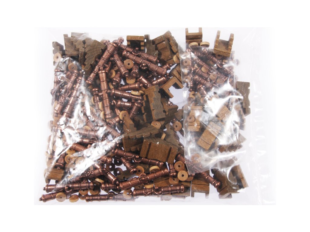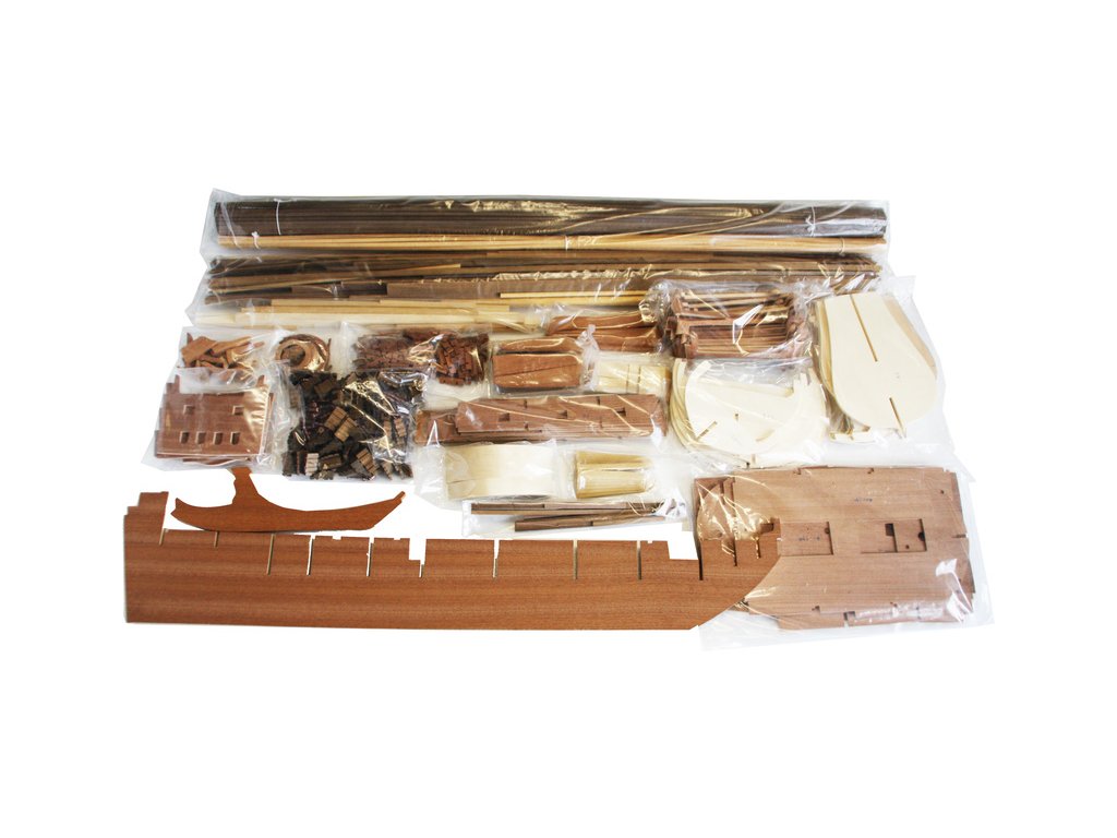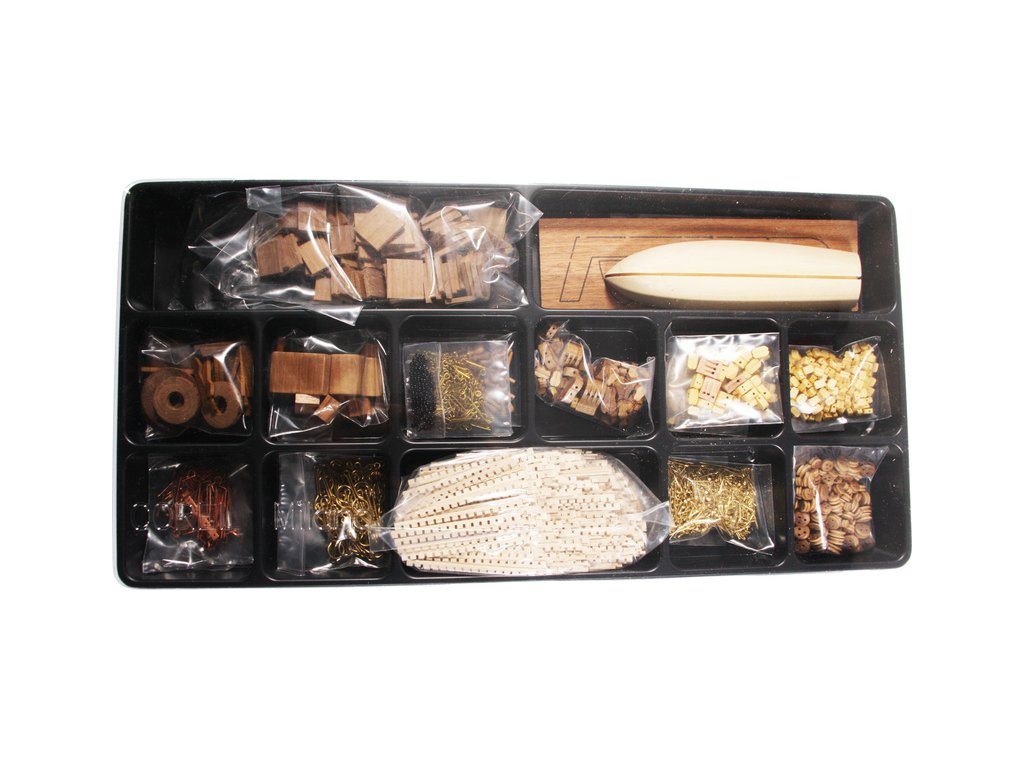 Balení obsahuje sadu překližkových dílů, sadu dřevěných lišt o různém průřezu, blistr s drobnými díly, díly z mosazi, sadu výkresů a vícejazyčný manuál.