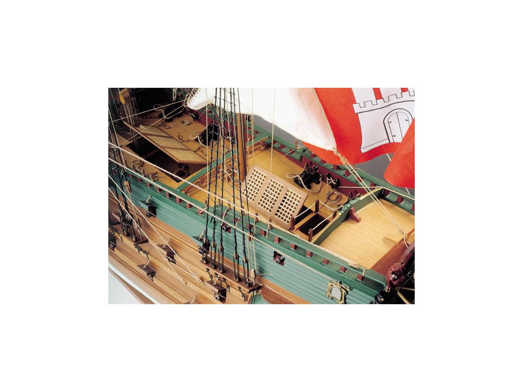 Stavebnice neplovoucí makety lodi COREL Wappen von Hamburg v měřítku 1:50 z roku 1667, byla loď která měla při rostoucím vlivu přístavu Hamburk chránit obchodní lodě. Loď měla bohatou výzbroj a krásné dekorace. Velká a velmi propracovaná stavebice pro nejnáročnější! V balení jsou dřevěné díly, lišty a množství kování, lanoví, plátno na plachty, plány atd.