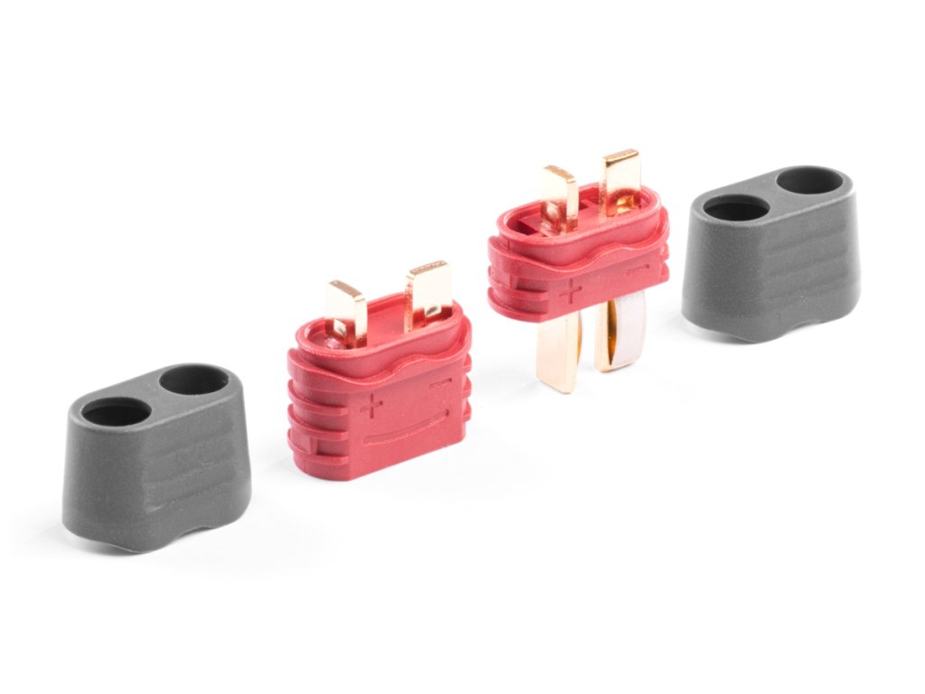 Dvoukolíkový silový konektor s plochými zlacenými kontakty se zatížitelností max. 50 A (dlohodobě 25A) se zaobleným drážkovaným tělem pro pevnější uchopení a kryty kabelů. Pro kabely o průřezu max. 3,3 mm2 (12AWG). Přechodový odpor 0,45 mOhm, max. 500 V. Balení 50 párů s kryty kabelů.Doplňkové parametry