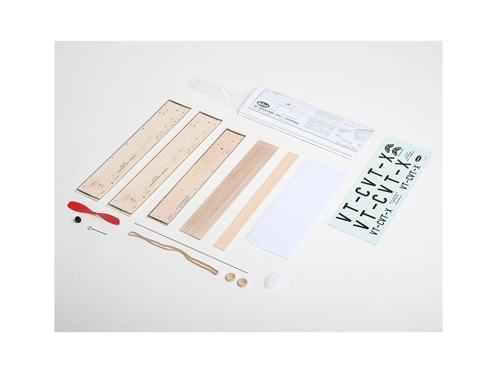 Stavebnice obsahuje: balsové předseknuté díly, balsové nosníky, vakuově lisované díly (kryt motoru, kryt kabiny), plastovou vrtuli s hřídelí a hlavicí, gumový svazek, vysoustružená balsová kola, ocelovou strunu na podvozek a další drobné díly, potahový papír, aršík mokrých obtisků, stavební plán.