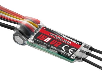 Střední řada regulátorů firmy Hobbywing pro modely letadel. Spínaný BEC 5,2V 2,5A. Trvalý proud 20A, špičkový 30A. Napájení 2-4S. Hmotnost 13g. Rozměry 25x15x5mm.