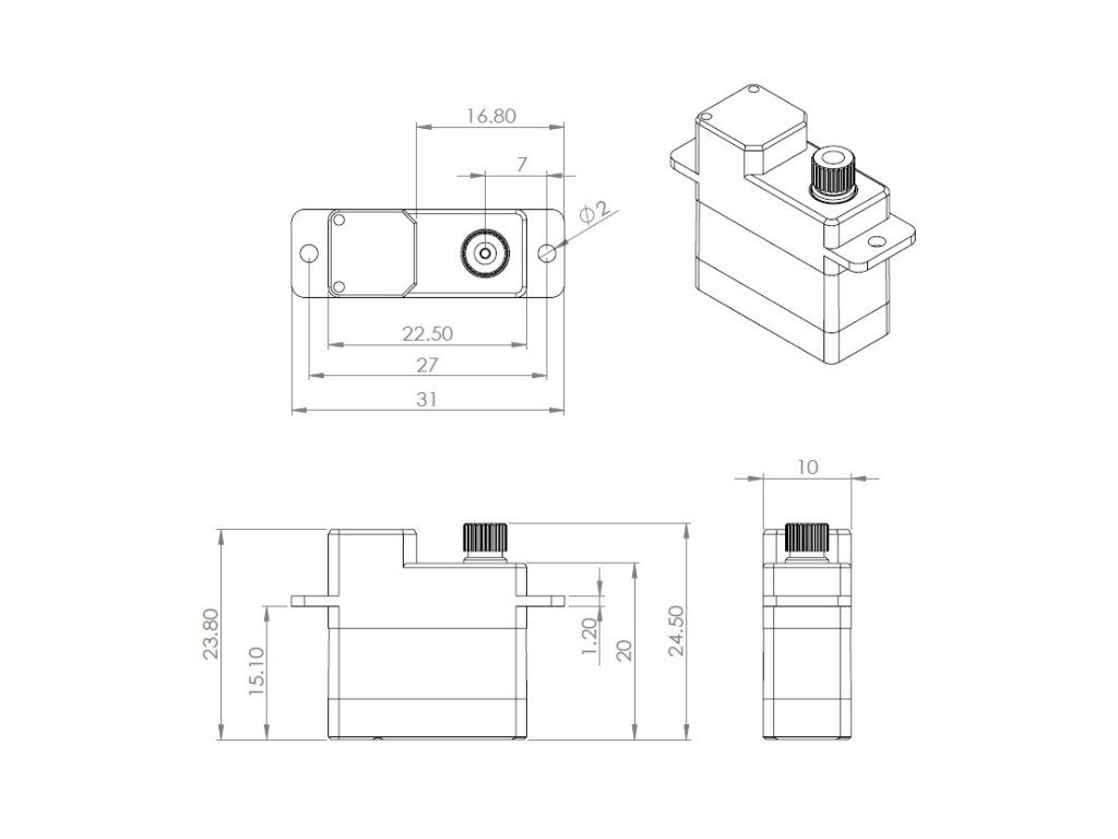 Velmi silné a rychlé programovatelné tenké digitální mikroservo s kovovými převody s výstupní hřídelí uloženou na dvou jehlových a jednom samomazném ložisku. Díky ploché krabičce s výškou 10 mm je zvláště vhodné pro ovládání křidélek a klapek v RC házedlech, menších větroních a motorových modelech.