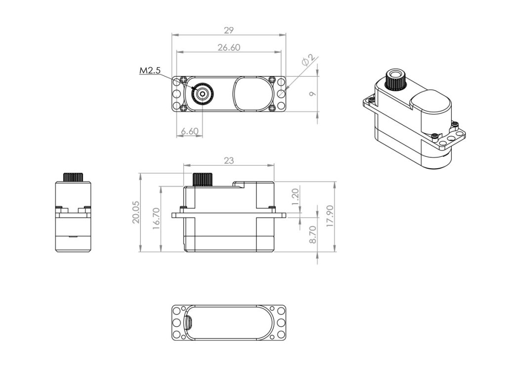Silné programovatelné tenké digitální mikroservo s titanovými převody uloženými na jednom kuličkovém, jednom samomazném a dvou jehlových ložiscích. Díky přesným předepjatým převodům s minimálními vůlemi a ploché krabičce s výškou 9 mm je zvláště vhodné pro ovládání křidélek a klapek v RC házedlech F3K, malých větroních a motorových modelech s tenkými profily křídla, jako jsou F5D modely pro závody okolo pylonů. Pro dokonalé chlazení i při vysokém zatížení je servo uloženo v hliníkové krabičce bez patek.