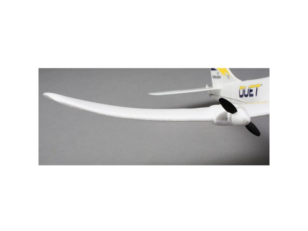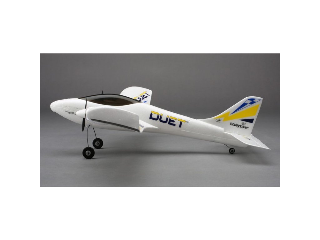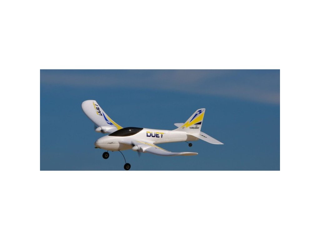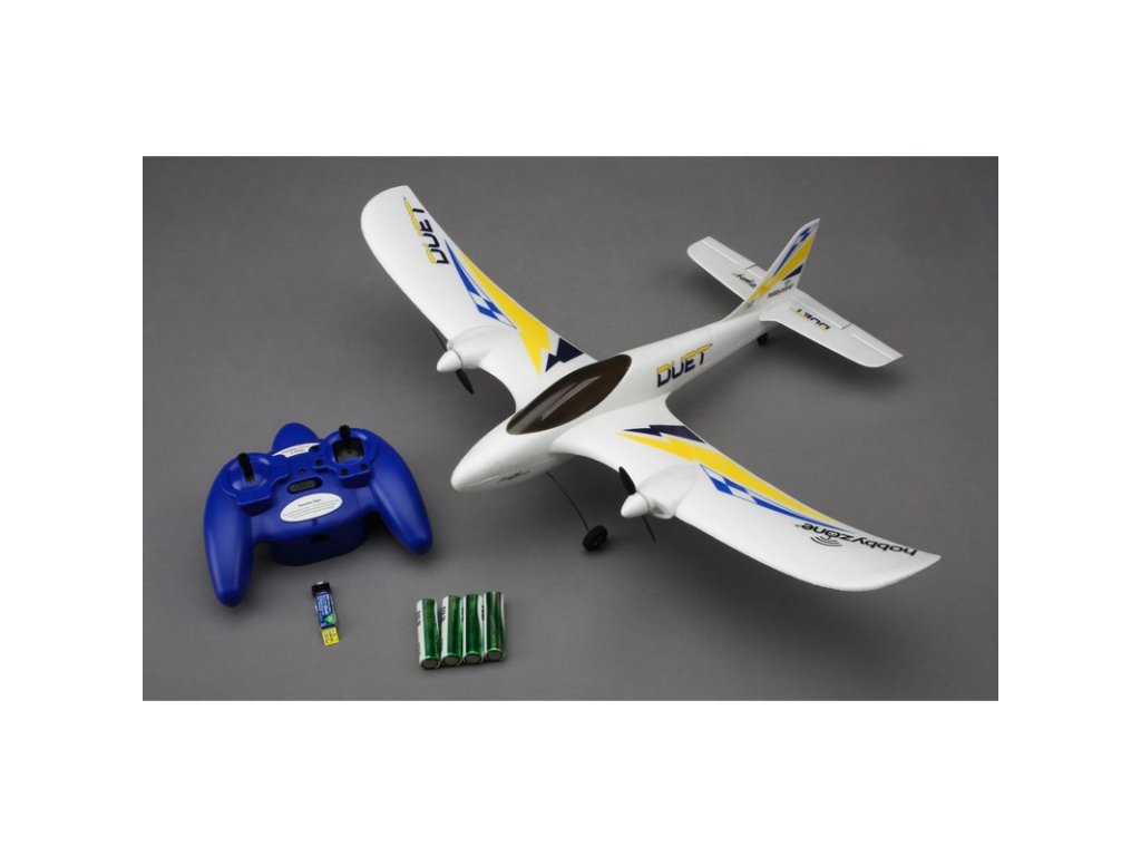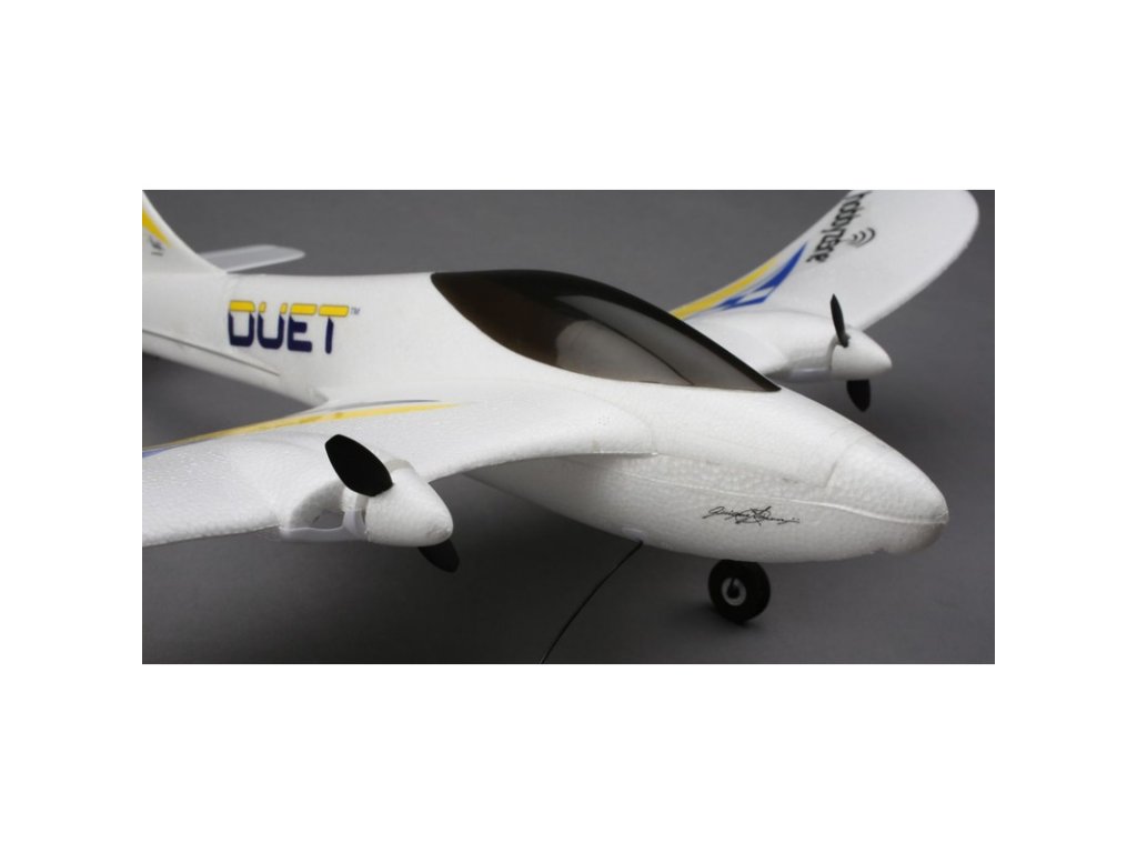 Model je kompletně sestaven a připraven k letu. Pohonný LiPol akumulátor o kapacitě 150 mAh se nabíjí přímo ve vysílači, sada 4 ks alkalických AA baterií je součástí balení. Duet je vyroben z odolné pěnové hmoty, má odnímací podvozkovou nohu pro možnost přestání do trávy.