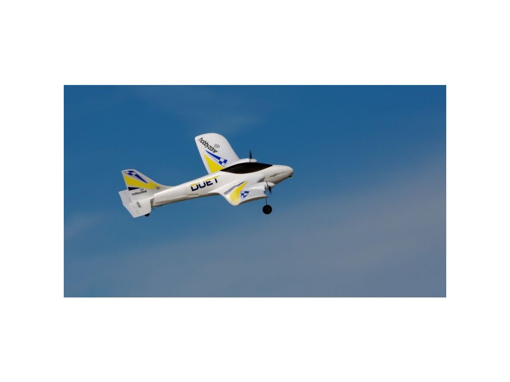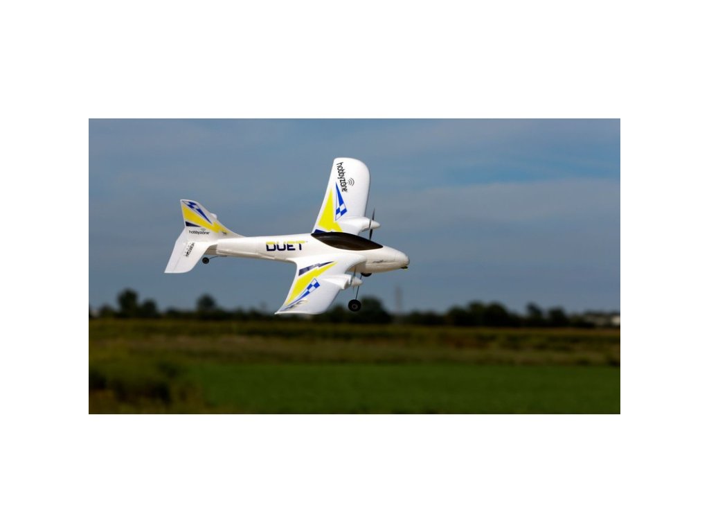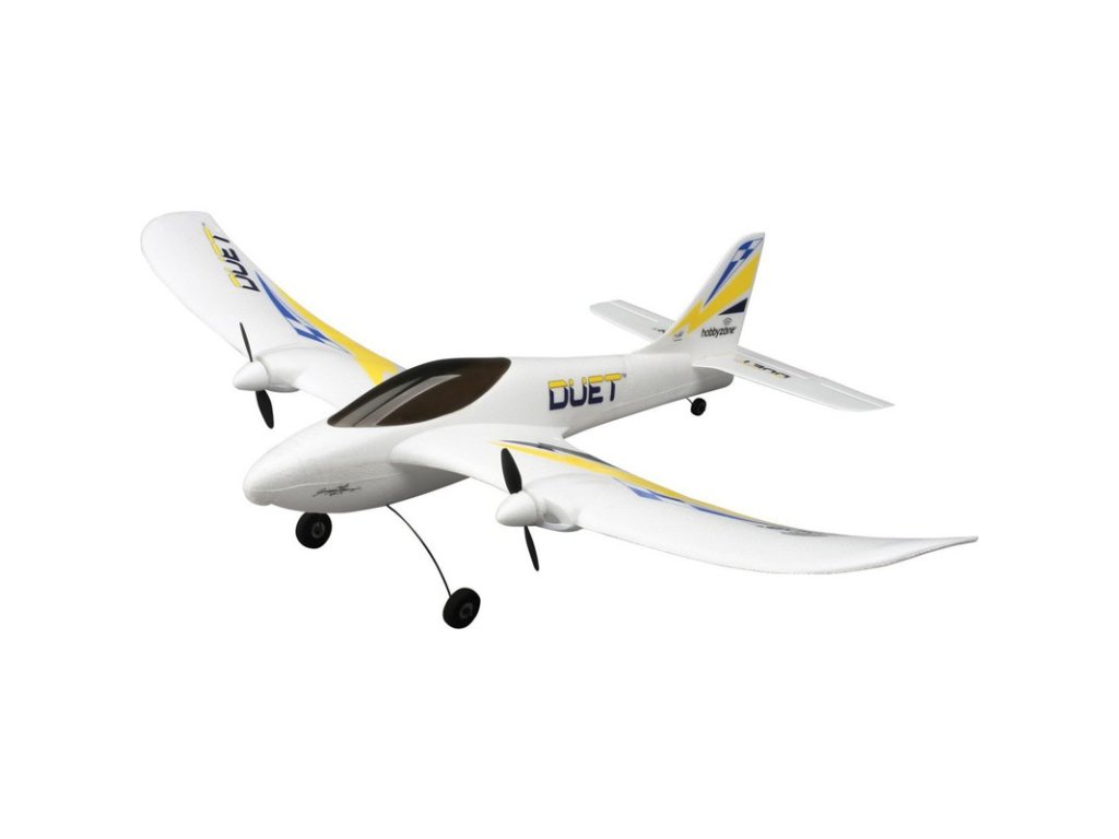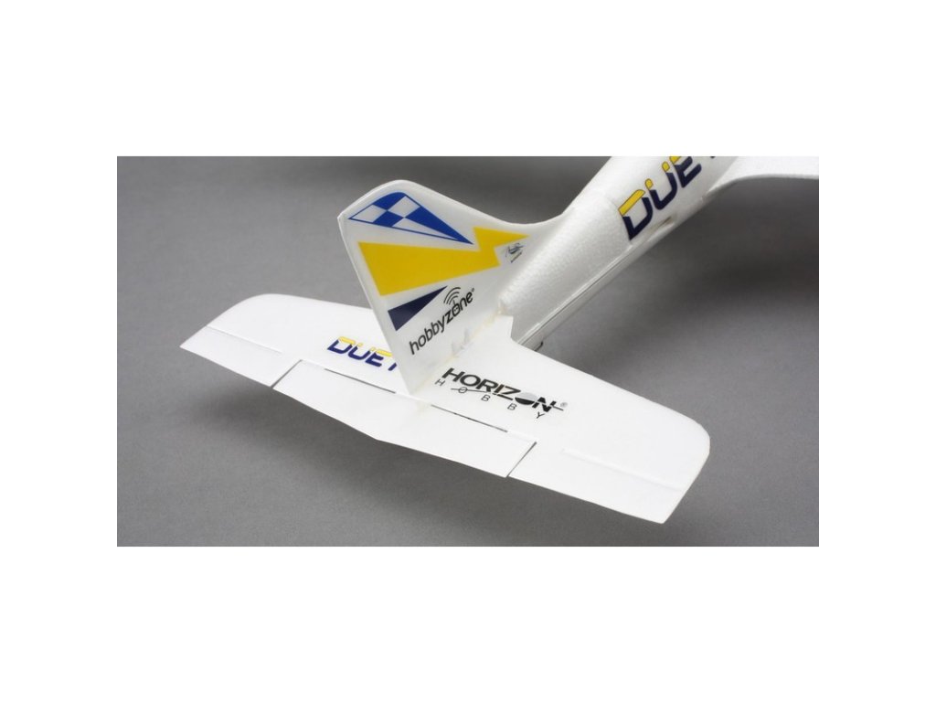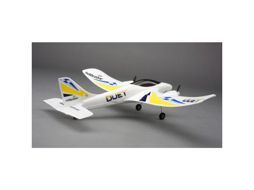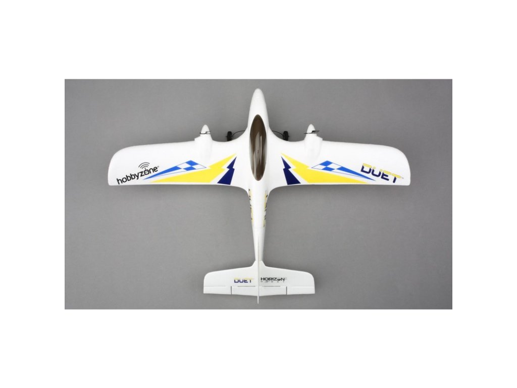 Model je kompletně sestaven a připraven k letu. Pohonný LiPol akumulátor o kapacitě 150 mAh se nabíjí přímo ve vysílači, sada 4 ks alkalických AA baterií je součástí balení. Duet je vyroben z odolné pěnové hmoty, má odnímací podvozkovou nohu pro možnost přestání do trávy.