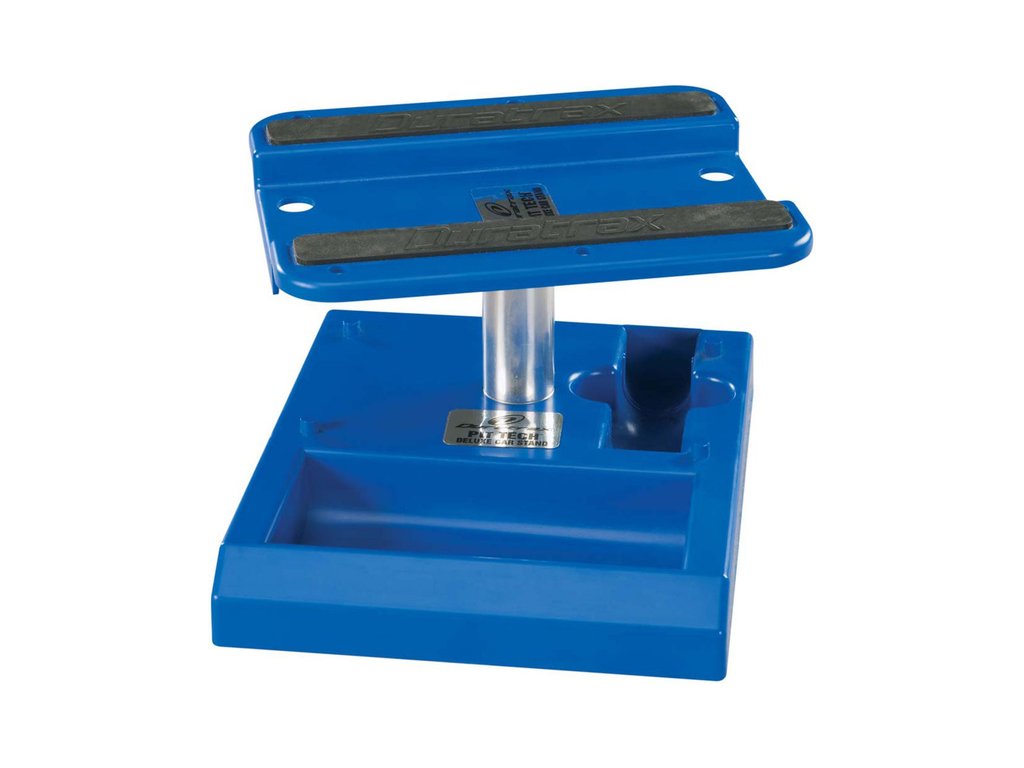 Duratrax Stojánek na auto Pit Tech Deluxe modrý pro servis aut 1:10. Pryžové podložky na deskách stojánku drží šasí na podložce, robustní stojan lze snadno demontovat a úsporně uložit. Vrchní deska je otočná, užitečná pomůcka při servisu modelu auta.